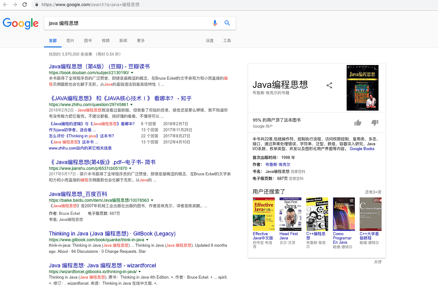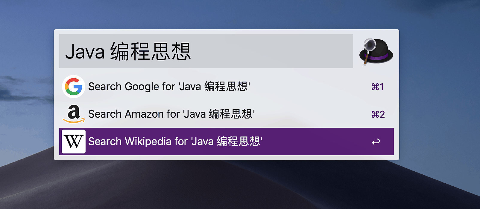 嗯,我们需要至少3步。那么有了 alfred,只需要,快捷键启动 alfred,然后输入你需要搜索的内容,回车就 ok 了。比如要搜索 Java 编程思想,我们 command + 空格调出 alfred 直接输入关键词,他默认可以去谷歌、亚马逊 维基百科搜索,当然你可以自行定制更多的搜索引擎。