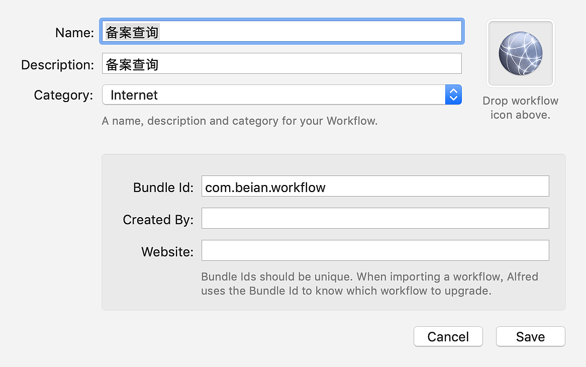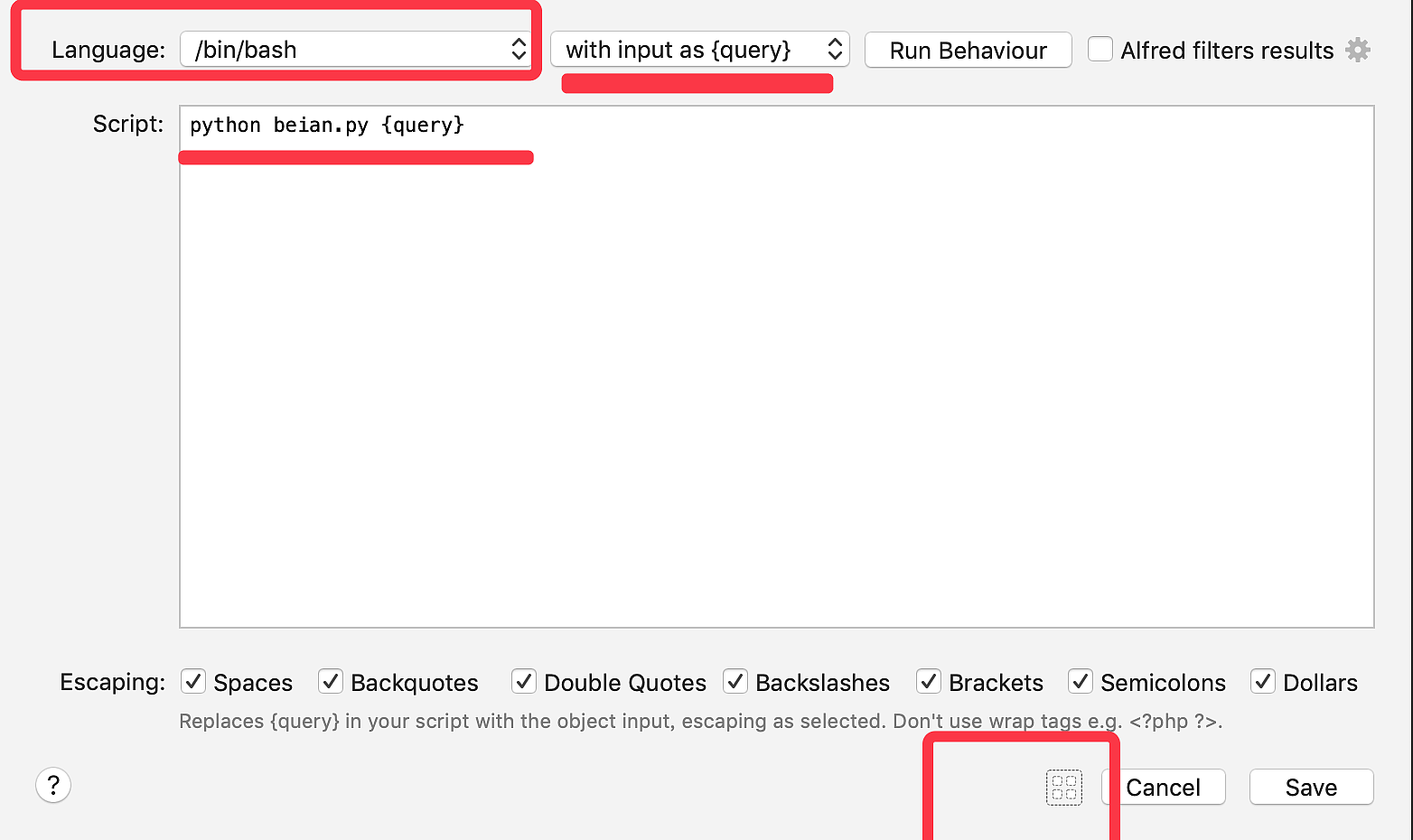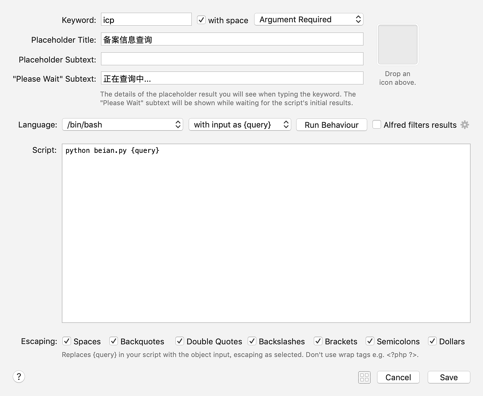 我们使用 python 去编写这个备案查询的工具, 语言选 bash,然后选择 with input as {query} ,如图所示设置完之后,点击右下角的按钮,打开这个项目的目录,我们需要添加几个文件和目录,其中 info.plist 是自带的,其他都需要单独添加