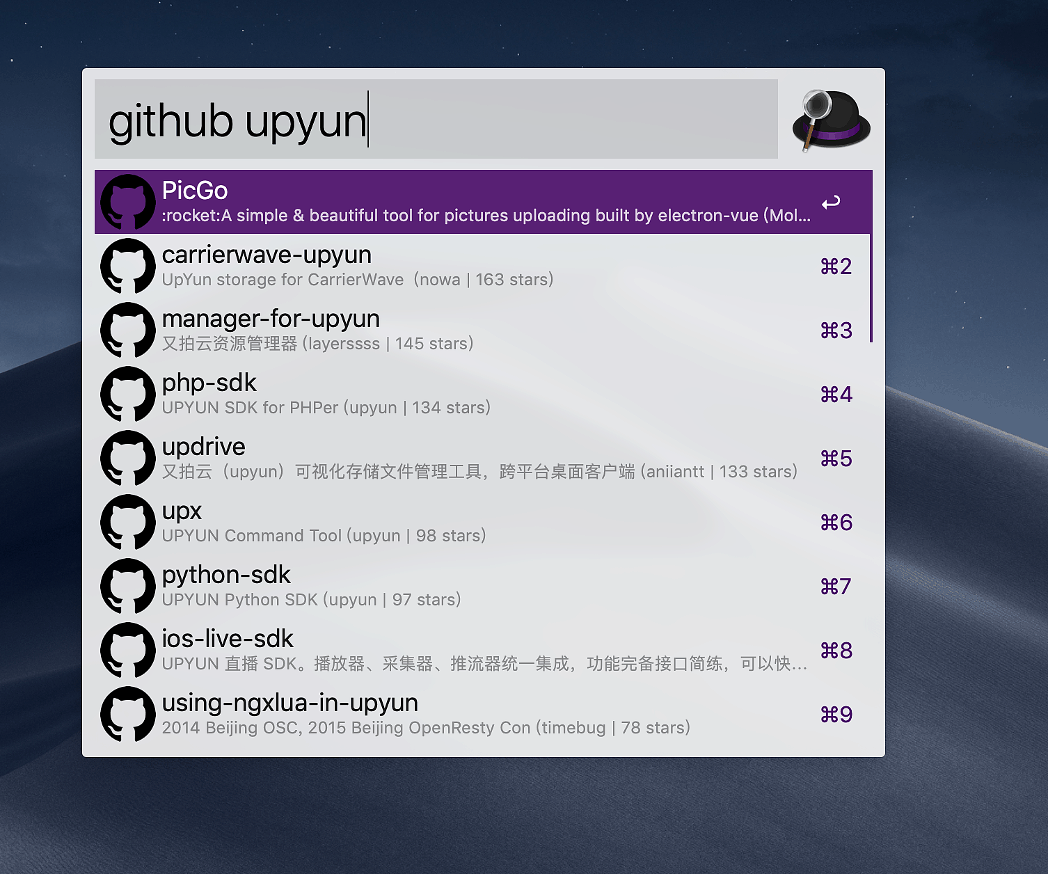 这样一个插件就编写好了。这些语法请参考 http://www.deanishe.net/alfred-workflow/