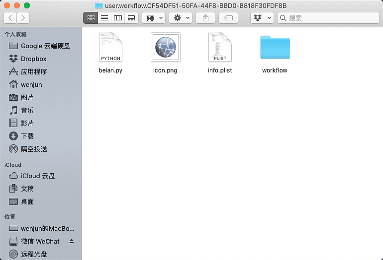 就得到workflow 这个目录了,这个目录下都是workflow 的 python 库,目前只能使用 python2.x 编写插件。当然其他语言也是支持的。比如 shell php ruby 等。