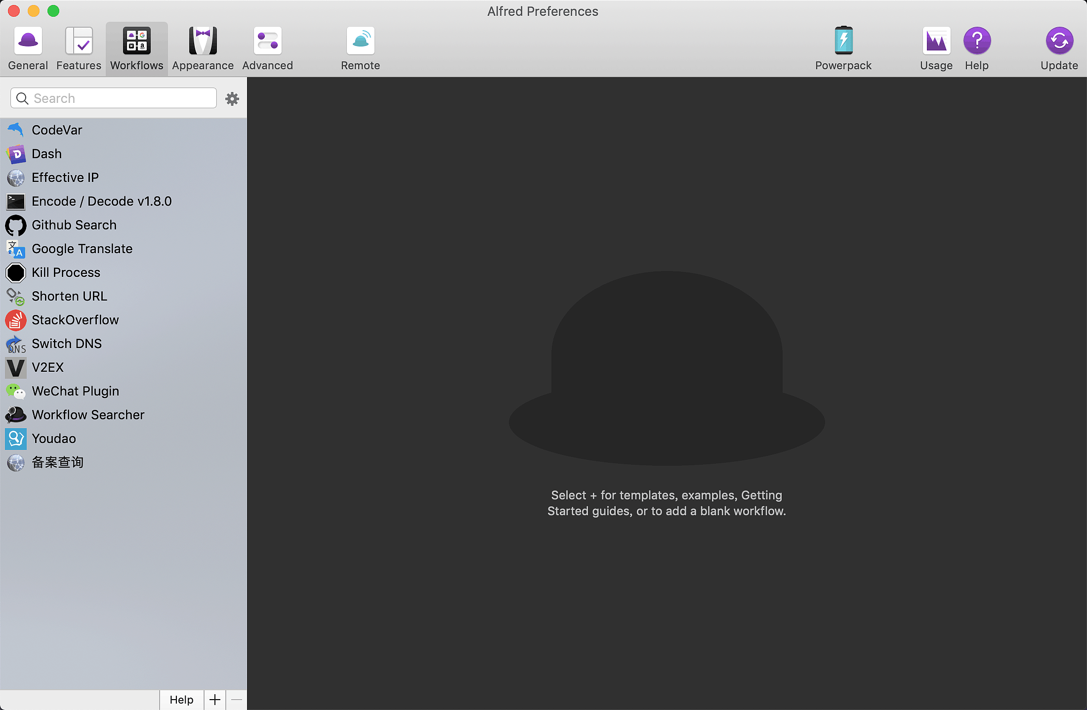 1.首先,我们打开 alfred 的 Preferences –切换到 workflows