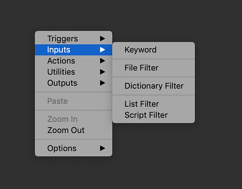 在右侧这个黑色的工作区,我们点击右键 新建一个脚本,选择 input –script Filter