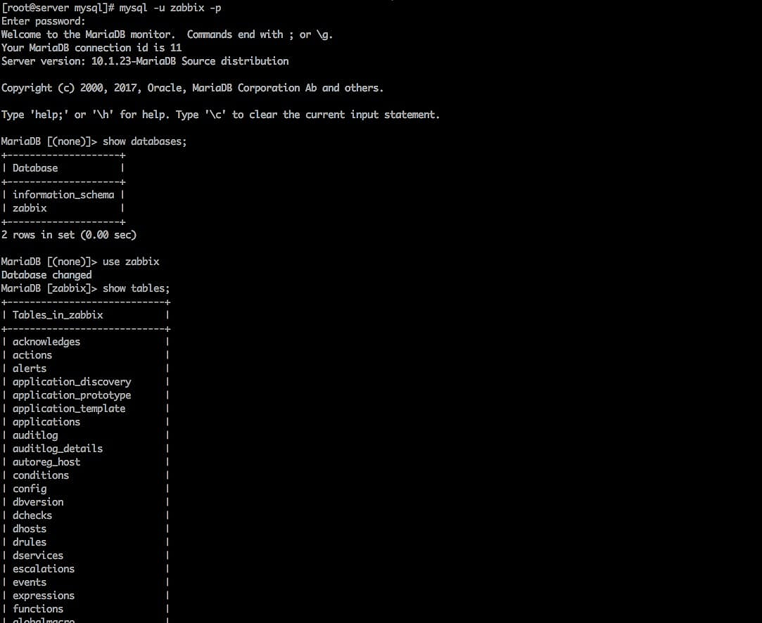 [root@server mysql]# mysql -uzabbix -p zabbix < schema.sql Enter password: [root@server mysql]# mysql -uzabbix -p zabbix < images.sql Enter password: [root@server mysql]# mysql -uzabbix -p zabbix < data.sql Enter password: