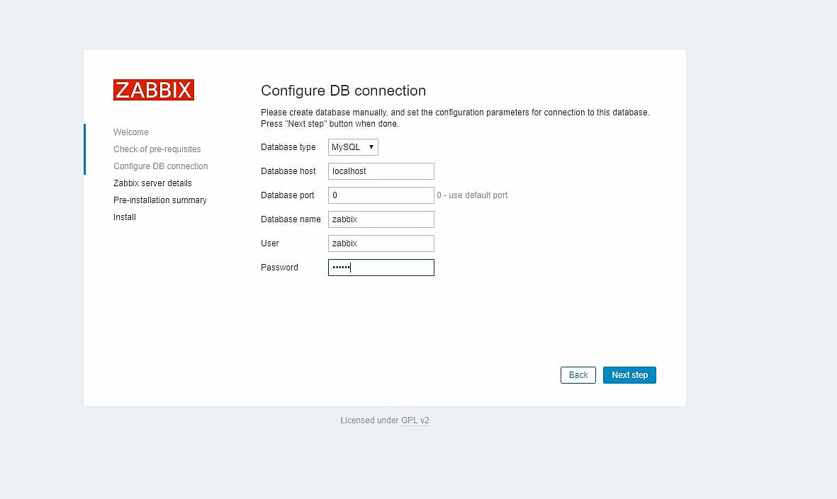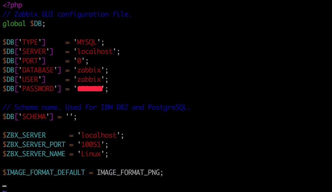 DBHost = localhost DBName = zabbixDBUser = zabbixDBPassword = zabbix