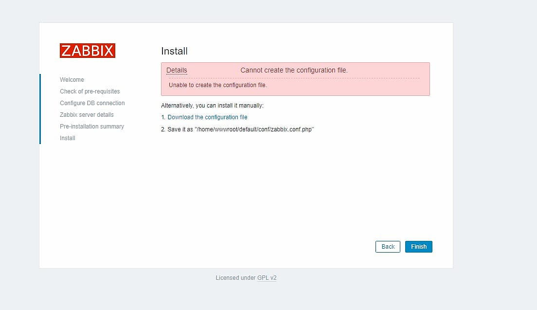 17.原因是 web 目录读写权限文件,设置下然后拷贝文件然后在 web 目录下传创建zabbix.conf.php粘贴进去