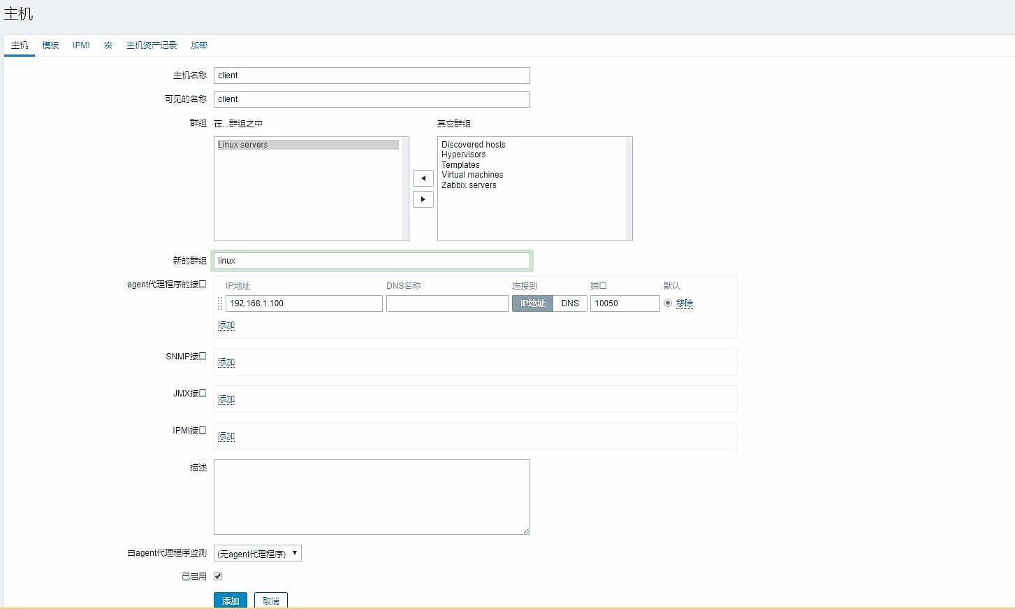 [root@client ~]# setenforce 0 #需要关selinux 否则无法启动 [root@client ~]# systemctl restart zabbix-agent.service [root@client ~]# systemctl status zabbix-agent.service [root@client ~]# systemctl enable zabbix-agent.service
