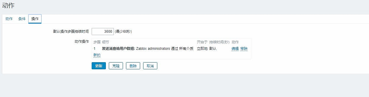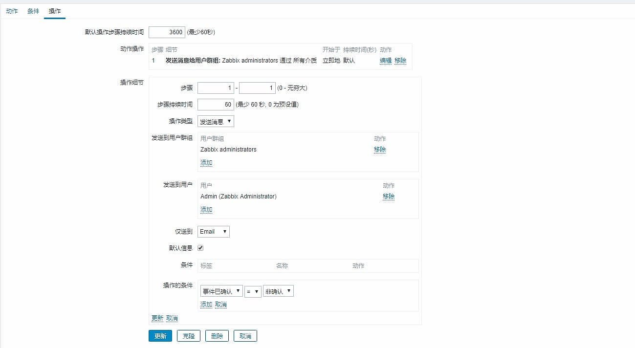 1.配置动作持续时间 2.配置具体步骤:这里可以设置第1-3步触发报警发送邮件给管理员,第4步直接发送告警邮件给经理,可以实现故障升级的概念。 3.步骤持续时间,这里设置的是60秒,每隔60秒会发送一次邮件 4.选择操作类型为:发送消息 5.选择发送到指定的用户组 6.选择发送到指定的用户 7.选择示警媒介为电子邮件报警(电子邮件报警是我在后边报警媒介类型中创建的,为了让大家理清创建思路,你在配置时没有这个选项可以在配置好报警媒介类型后再进行配置) 8.选择事件确认,如果界面点击了事件确认,将不发送报警邮件。