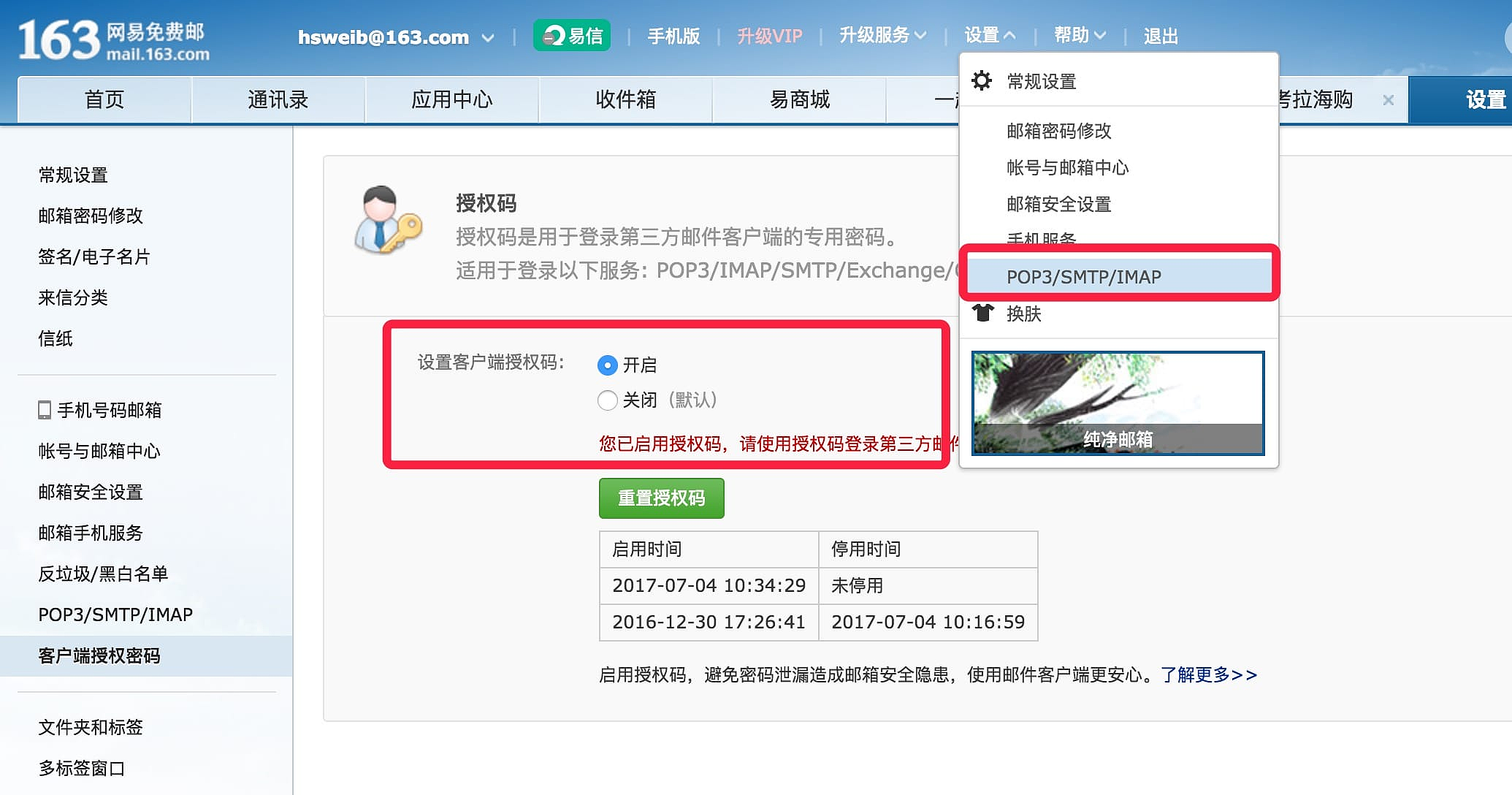 注意: 163需要配置客户端授权码,填写的密码是客户端授权码而不是邮箱真实密码。否则无法验证成功。
