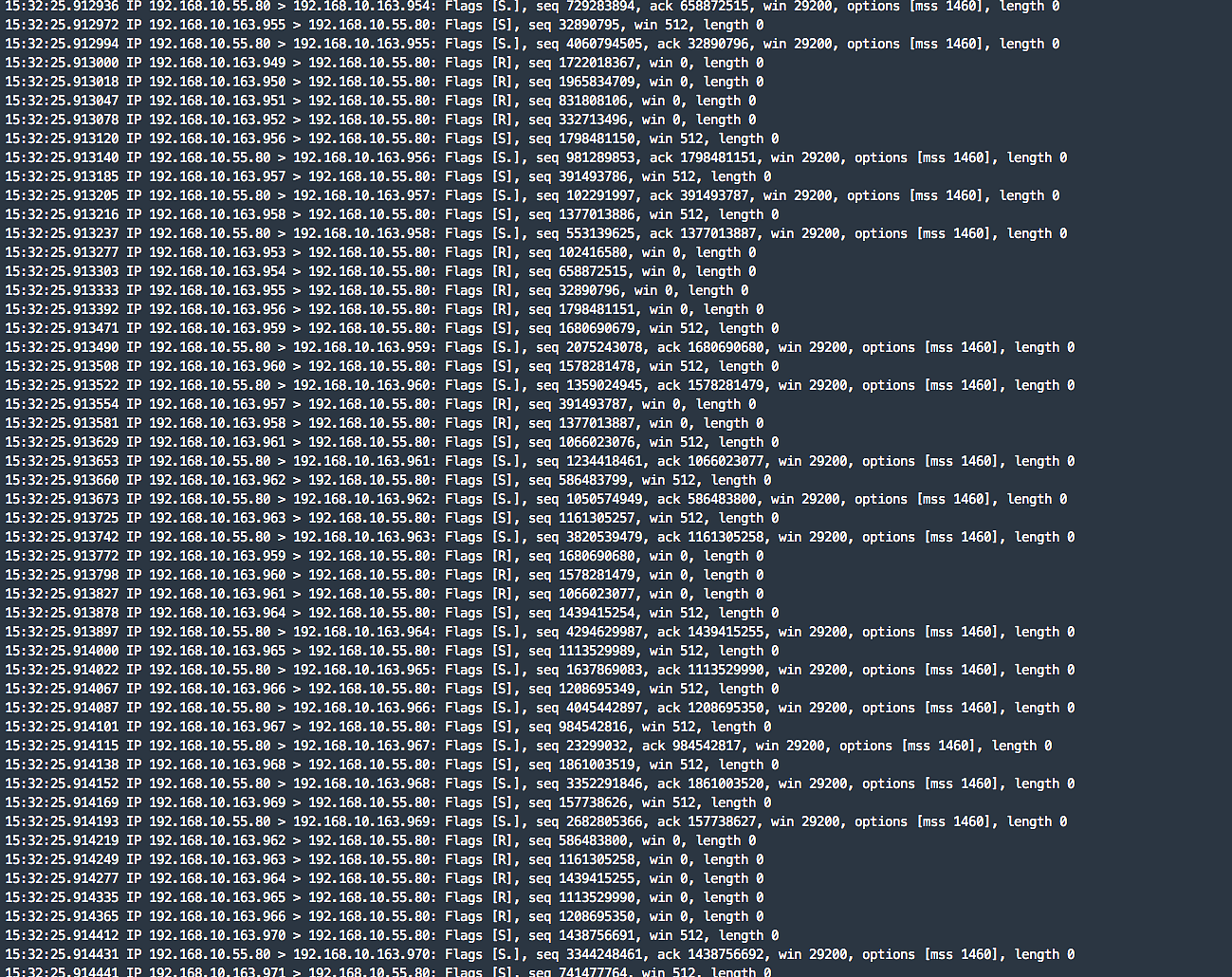 我们可以看到 源 IP 192.168.10.163 的996 端口向主机 192.168.10.55 80端口发送SYN。