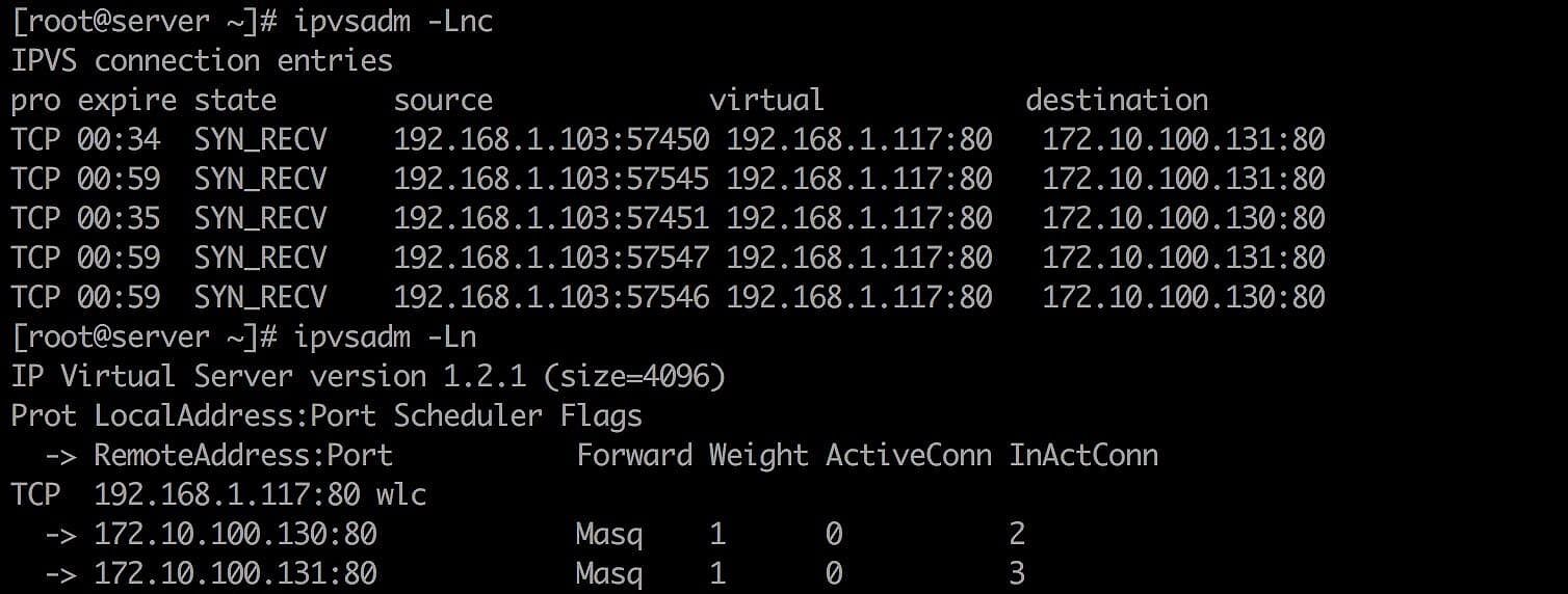 [root@server ~]# ipvsadm -Lnc IPVS connection entries pro expire state source virtual destination [root@server ~]# ipvsadm -L IPVirtualServer version 1.2.1 (size=4096) ProtLocalAddress:PortSchedulerFlags -> RemoteAddress:PortForwardWeightActiveConnInActConn [root@server ~]# ipvsadm -C [root@server ~]# ipvsadm -A -t 192.168.1.117:80 -s wlc [root@server ~]# ipvsadm -a -t 192.168.1.117:80 -r 172.10.100.130:80 -m [root@server ~]# ipvsadm -a -t 192.168.1.100:80 -r 172.10.100.131:80 -m Memory allocation problem