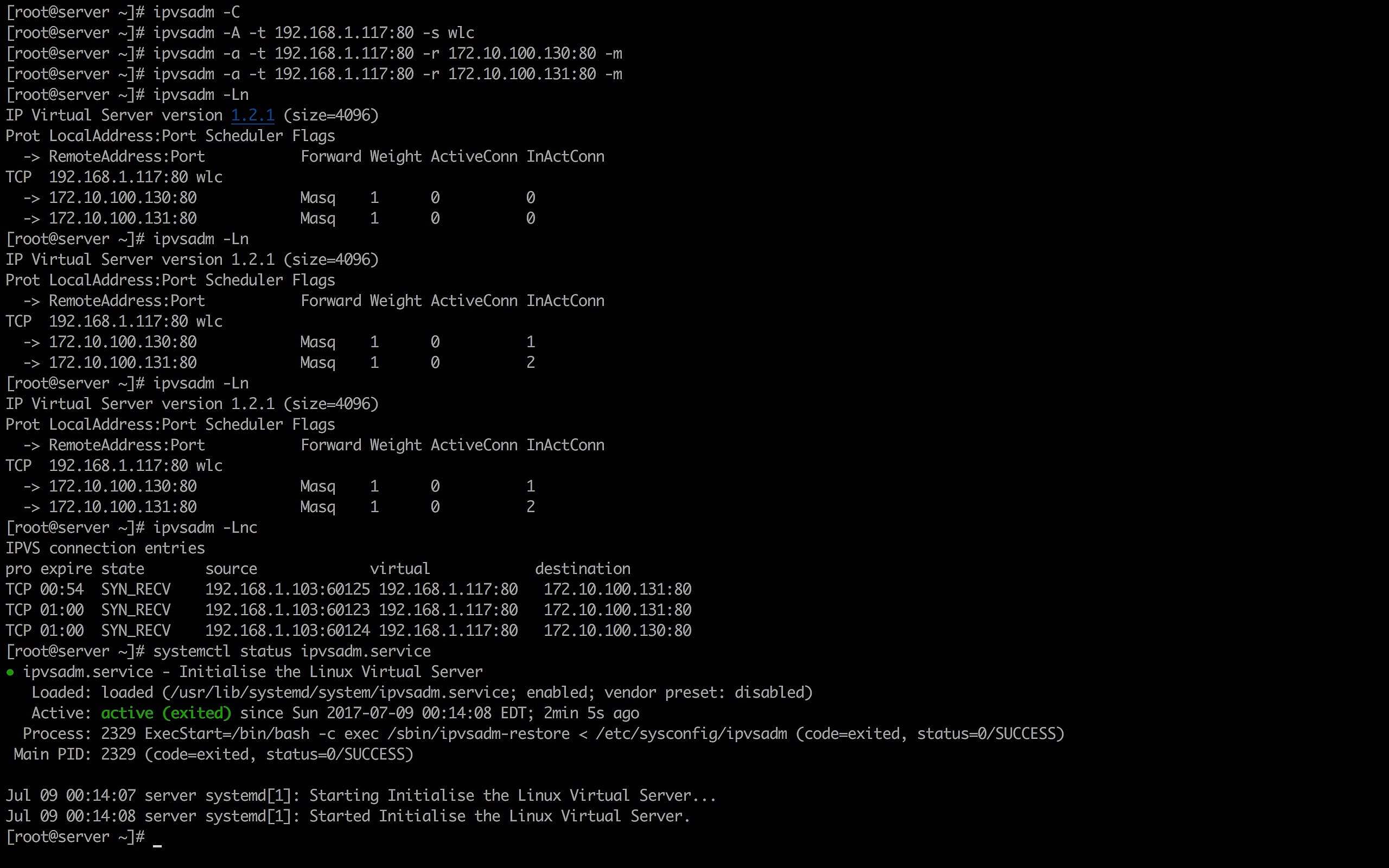 [root@server ~]# touch /etc/sysconfig/ipvsadm [root@server ~]# systemctl restart ipvsadm [root@server ~]# systemctl status ipvsadm -l ● ipvsadm.service - Initialise the Linux Virtual Server Loaded: loaded (/usr/lib/systemd/system/ipvsadm.service; enabled; vendor preset: disabled) Active: active (exited) since Sun 2017-07-09 00:04:50 EDT; 2s ago Process: 3021 ExecStart=/bin/bash -c exec /sbin/ipvsadm-restore < /etc/sysconfig/ipvsadm (code=exited, status=0/SUCCESS) Main PID:3021 (code=exited, status=0/SUCCESS)