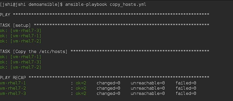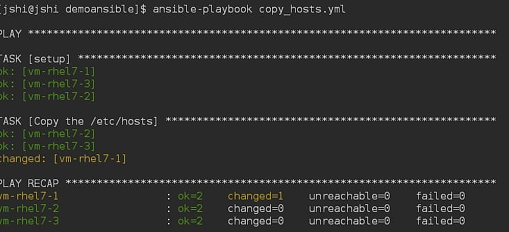 TASK的状态是ok,由于第一次执行copy_hosts.yml的时候,已经拷贝过文件,那么ansible目标文件的状态避免重复执行.