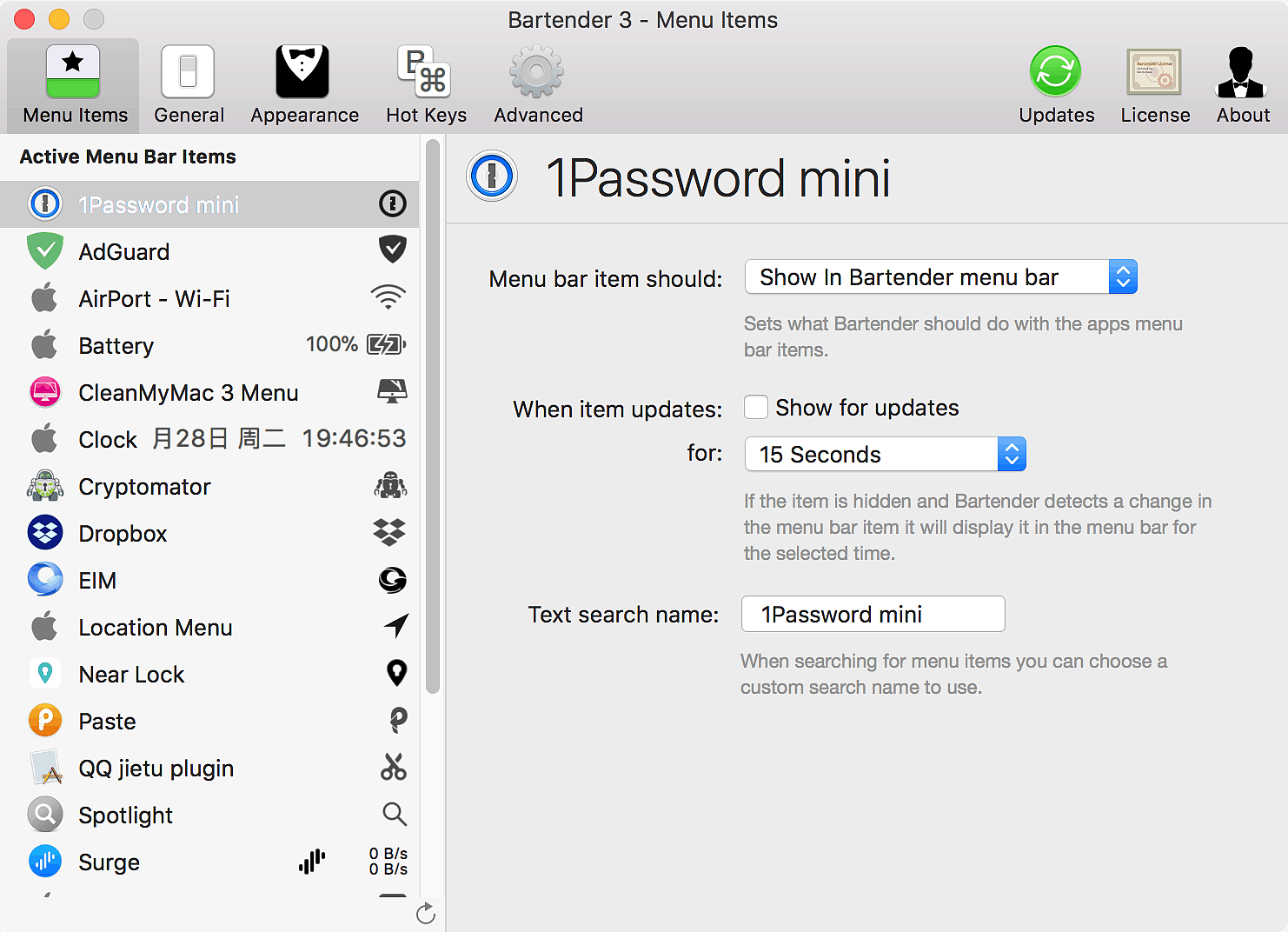 在mac上,经常要开很多软件,这导致菜单栏的图标满满的挤在了一起,这个时候,我就需要一款软件来隐藏一部分软件的图标,因为我只需要他静静的工作就行,购买了2款软件 Vanilla 和 Bartender。