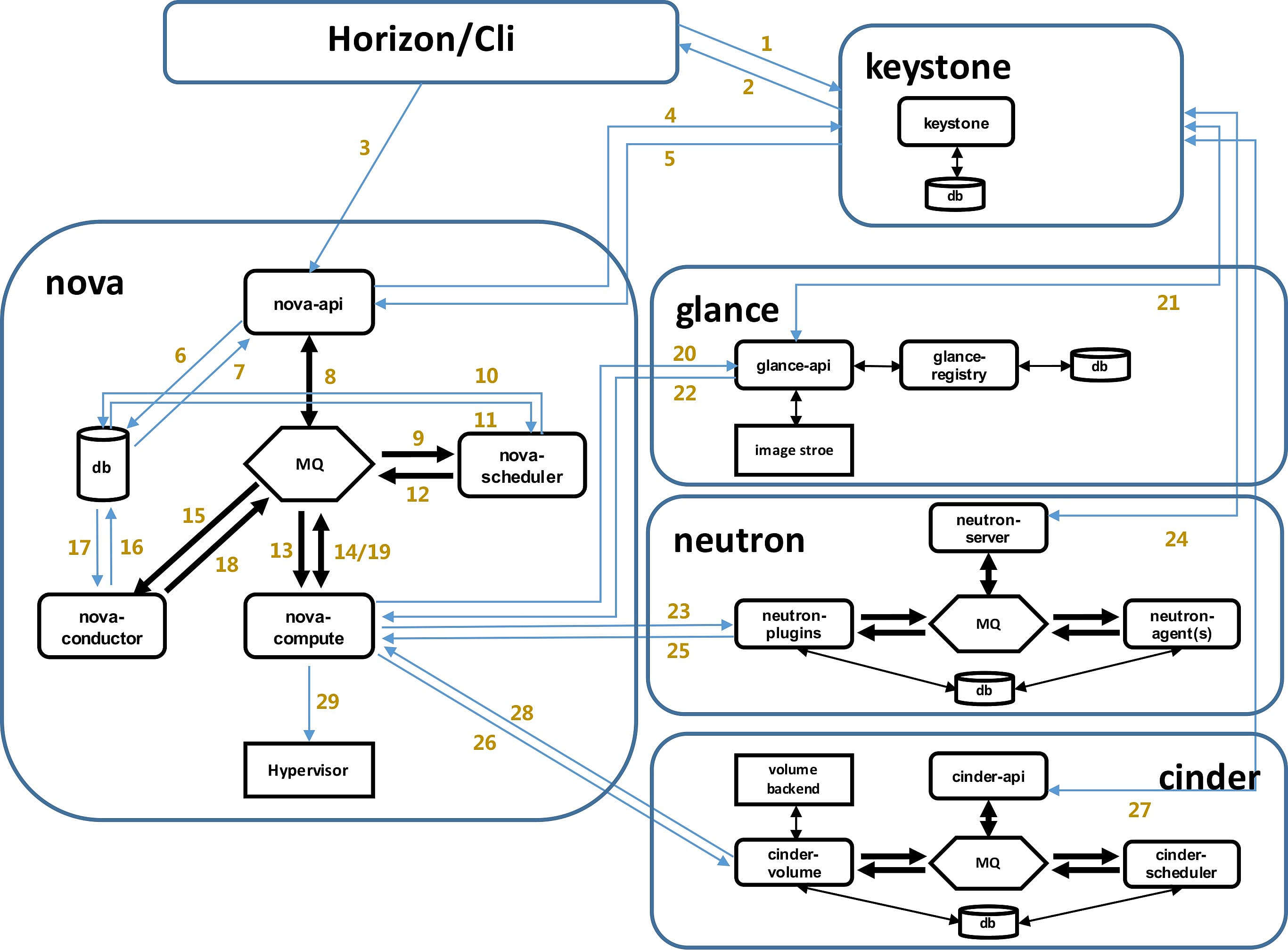 nova-compute通过keystone的RESTfull API拿到认证的token,并通过HTTP请求glance-api获取创建虚拟机所需要镜像。