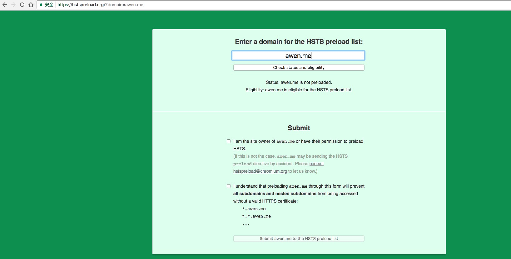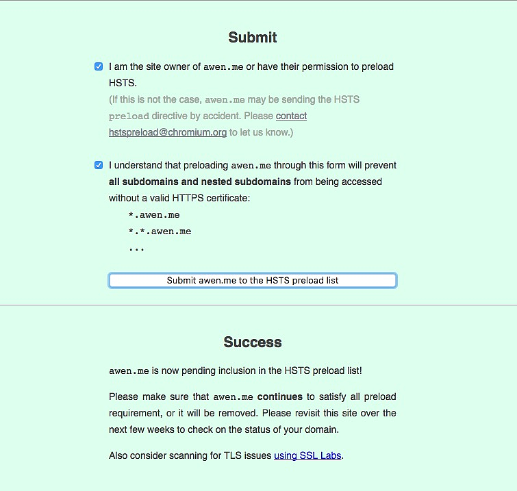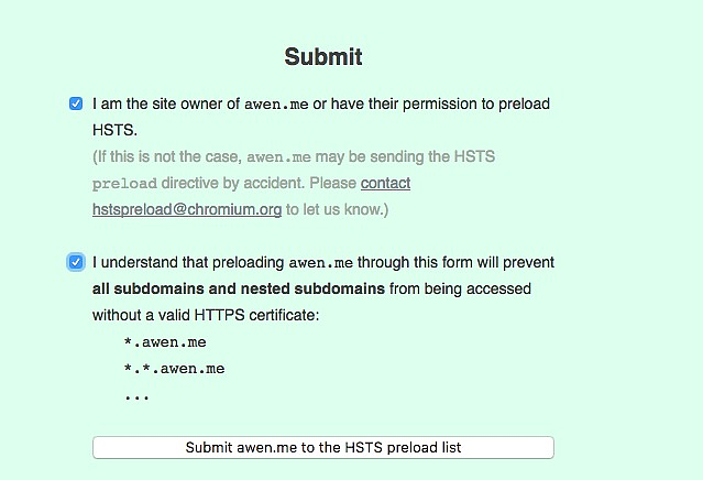 确认后,你就可以将你的域名提交给 HSTS 预加载列表了