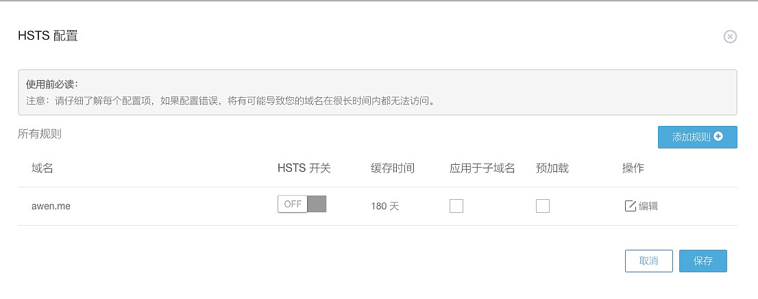- 配置缓存,HSTS 默认要求必须配置时间为180天