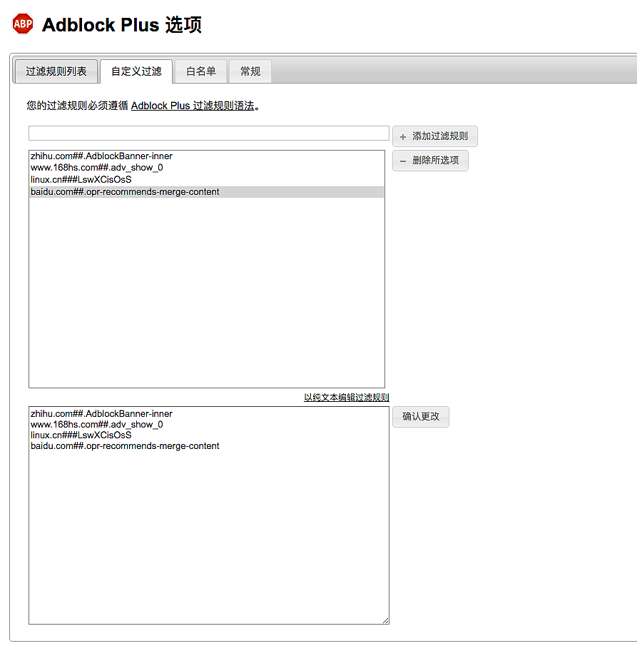 打开后添加如图所示的几个规则,基本上大部分网站的恶意广告都可以被屏蔽