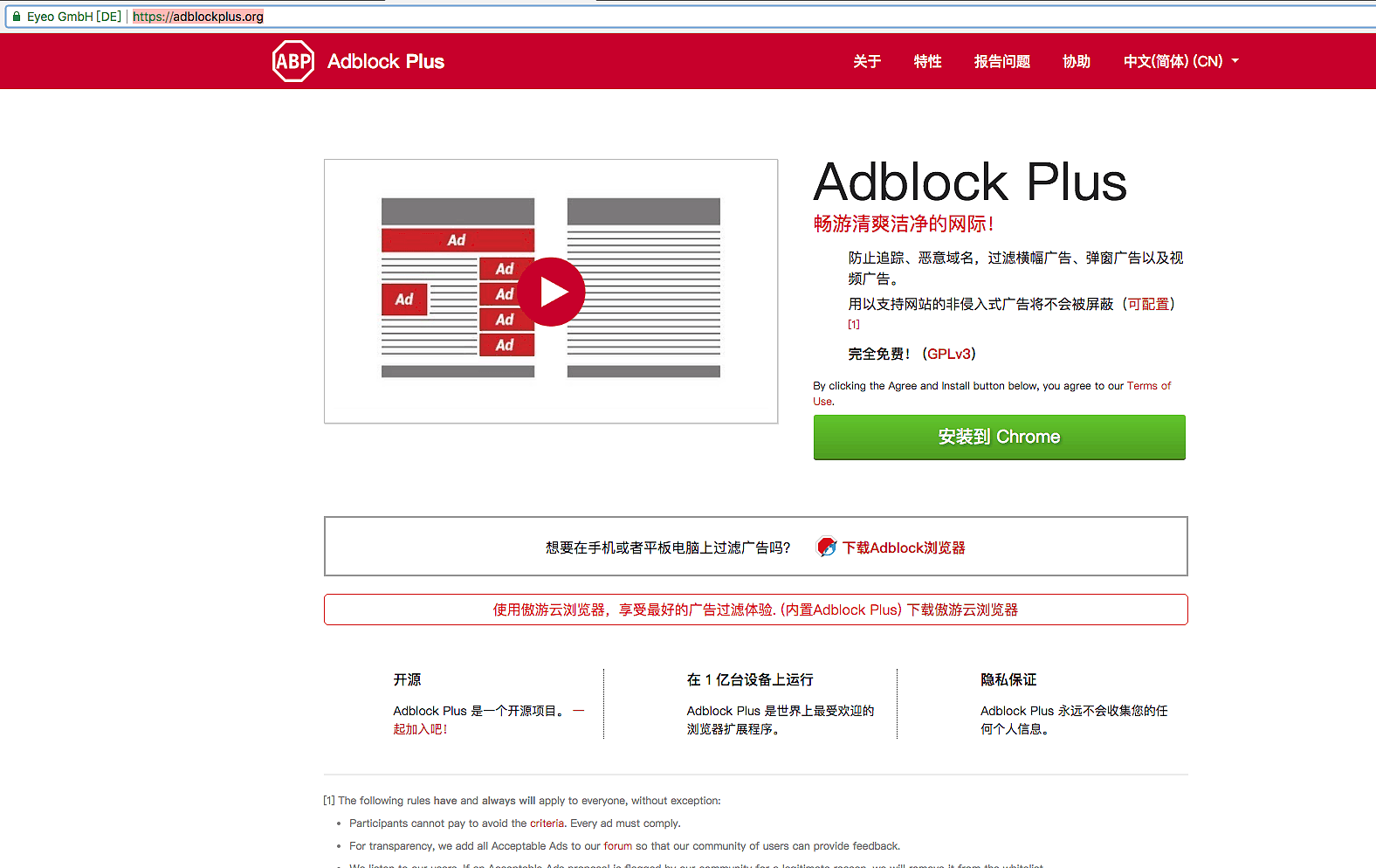 安装很简单,打开https://adblockplus.org/,它会自动识别你当前使用的浏览器,然后点击安装到 XXX 即可