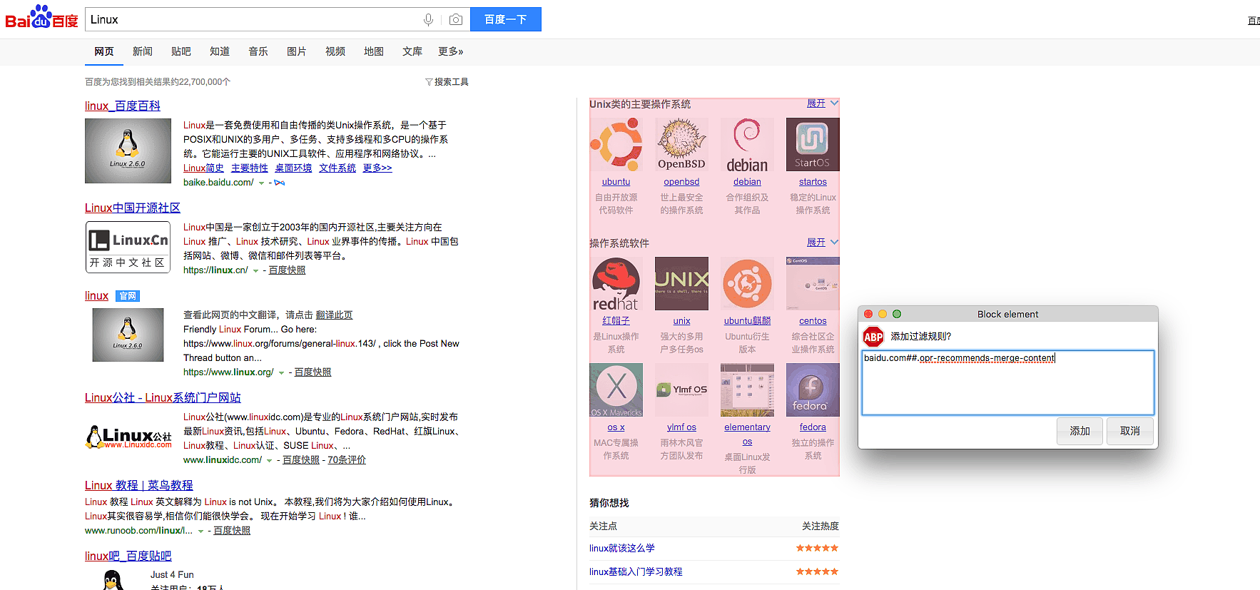 即可出现一个拦截规则窗口,点击添加对应的块元素就被屏蔽了