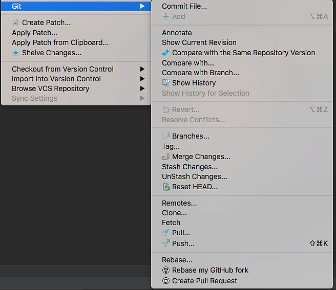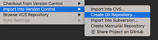 3.选择 VCS—>Import into Version Control—>Create git Repository… 将本地项目转换成一个 Git 仓库