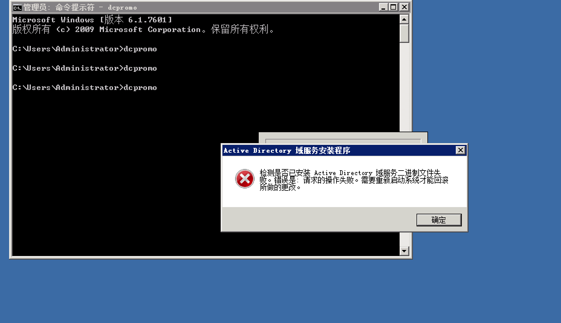 检测是否已安装Active Directory域服务二进制文件失败。错误是:请求的操作失败。需要重新启动系统才能回滚所做的更改。