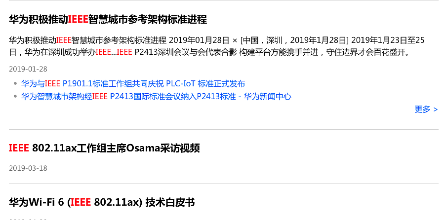 在此之前,华为一直有与 IEEE 合作,下图是华为官网搜索关键词 IEEE 的结果。