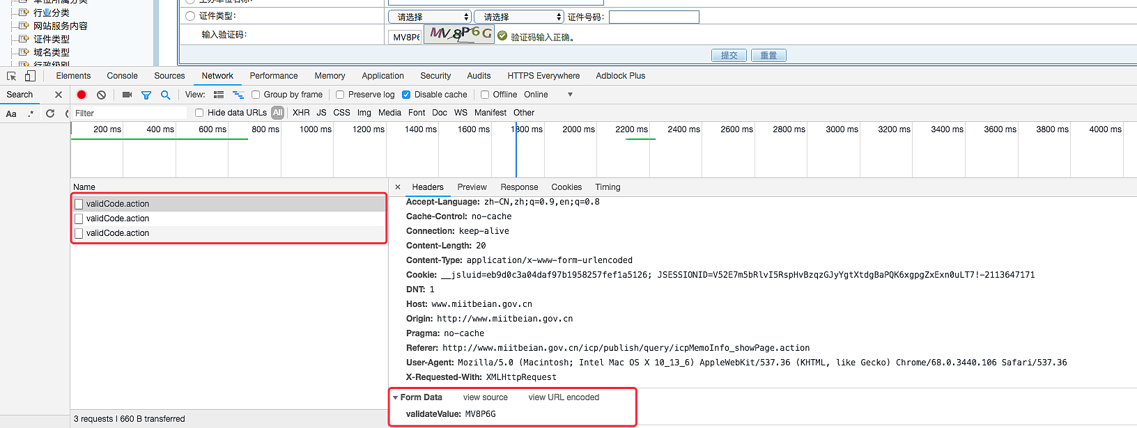 payload = {"validateValue": validateValue} headers = { 'content-type': "multipart/form-data; boundary=----WebKitFormBoundary7MA4YWxkTrZu0gW", 'Accept': "application/json, text/javascript, */*", 'Accept-Encoding': "gzip, deflate", 'Accept-Language': "zh-CN,zh;q=0.9,en;q=0.8", 'Cache-Control': "no-cache", 'Connection': "keep-alive", 'Content-Length': "20", 'Content-Type': "application/x-www-form-urlencoded", 'DNT': "1", 'Host': "www.miitbeian.gov.cn", 'Origin': "http://www.miitbeian.gov.cn", 'Pragma': "no-cache", 'Referer': "http://www.miitbeian.gov.cn/icp/publish/query/icpMemoInfo_showPage.action", 'User-Agent': "Mozilla/5.0 (Macintosh; Intel Mac OS X 10_13_6) AppleWebKit/537.36 (KHTML, like Gecko) Chrome/68.0.3440.106 Safari/537.36", 'X-Requested-With': "XMLHttpRequest", }