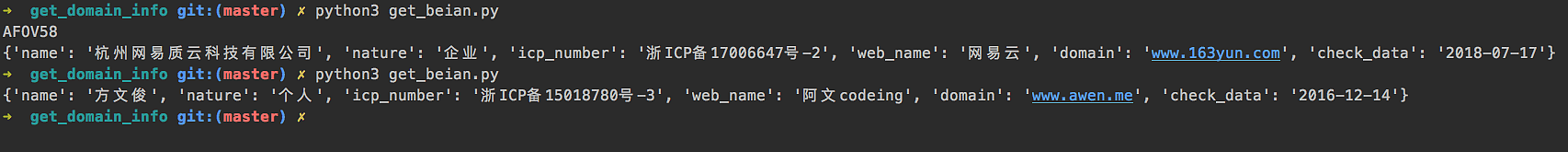 ➜ get_domain_info git:(master) ✗ python3 get_beian.py AFOV58 {'name': '杭州网易质云科技有限公司', 'nature': '企业', 'icp_number': '浙ICP备17006647号-2', 'web_name': '网易云', 'domain': 'www.163yun.com', 'check_data': '2018-07-17'} ➜ get_domain_info git:(master) ✗ python3 get_beian.py {'name': '方文俊', 'nature': '个人', 'icp_number': '浙ICP备15018780号-3', 'web_name': '阿文codeing', 'domain': 'www.awen.me', 'check_data': '2016-12-14'} ➜ get_domain_info git:(master) ✗