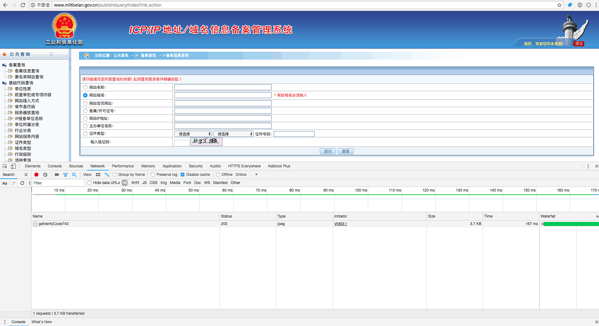 第一步,首先我们打开工信部的查询备案网站 http://www.miitbeian.gov.cn/publish/query/indexFirst.action ,然后用 chrome 打开开发者菜单,切换到 network,然后点击获取验证码,可以看到有一个请求