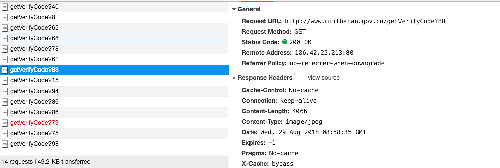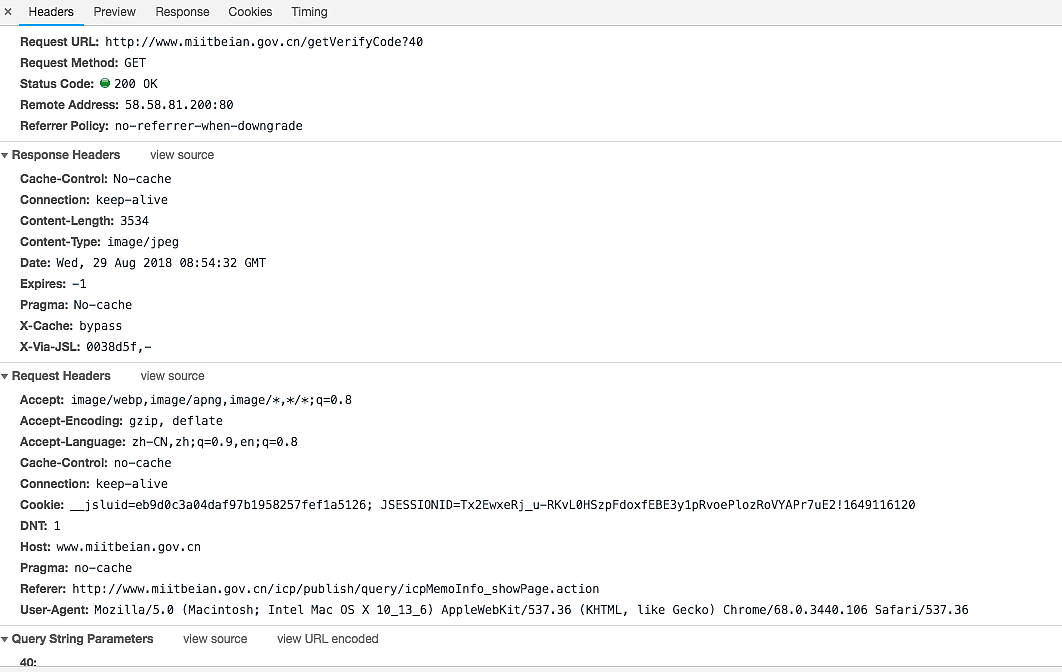 headers = { 'Accept': "image/webp,image/apng,image/*,*/*;q=0.8", 'Accept-Encoding': "gzip, deflate", 'Accept-Language': "zh-CN,zh;q=0.9,en;q=0.8", 'Cache-Control': "no-cache", 'Connection': "keep-alive", 'DNT': "1", 'Host': "www.miitbeian.gov.cn", 'Pragma': "no-cache", 'Referer': "http://www.miitbeian.gov.cn/icp/publish/query/icpMemoInfo_showPage.action", 'User-Agent': "Mozilla/5.0 (Macintosh; Intel Mac OS X 10_13_6) AppleWebKit/537.36 (KHTML, like Gecko) Chrome/68.0.3440.106 Safari/537.36", }
