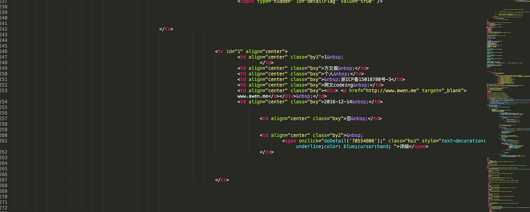 # 解析 html,获取对应的值存入 dict 中 soup = BeautifulSoup(html_context, "html.parser") soup_msg = soup.find_all(name='td', attrs={'class': "bxy"}) soup.prettify() icp_list = [] for content in soup_msg: content = content.get_text() content_out = "".join(content.split()) icp_list.append(content_out) icp_info = {"name": icp_list[0], "nature": icp_list[1], "icp_number": icp_list[2], "web_name": icp_list[3], "domain": icp_list[4], "check_data": icp_list[-2]} return icp_info