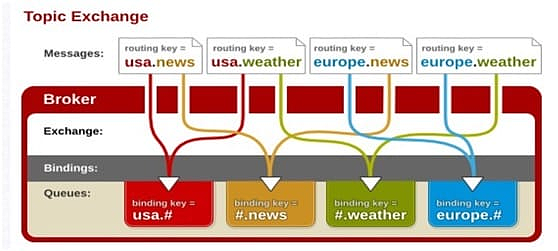 Topic类型交换机通过模式匹配分配消息的routing-key属性。将路由键和某个模式进行匹配,此时队列需要绑定到一个模式上。