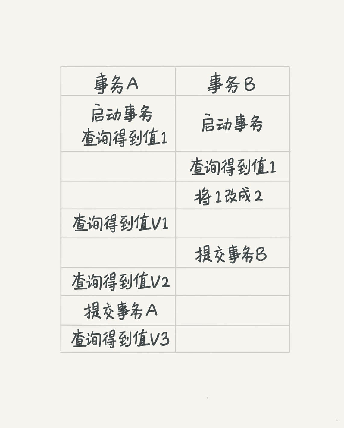若隔离级别是”读提交”,则 v1 是 1 v2 的值 是 2 ,事务 B 的更新在提交后才能被 A 看到,所以 v3 的值也是 2。