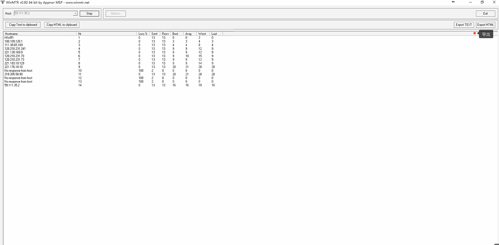 3.输入要测的 IP ,点击 start 开始,建议多测几分钟后停止,也可以到处 txt或 html 文档。