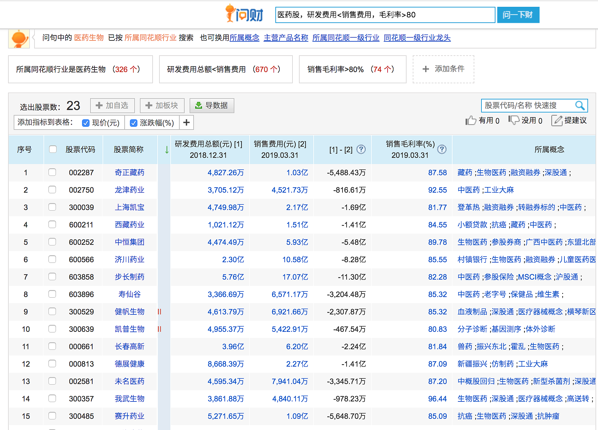 国内医药类厂商几乎没什么研发成本,我们来看医药类上市公司的研发费用和销售费用以及毛利率数据,这是爱问财搜索到的医药类上市公司的销售费用大于研发费用,并且毛利率高达80%以上的企业数据。