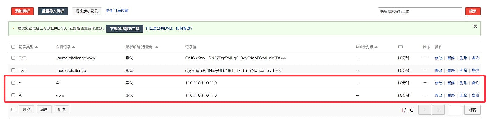 在 DNS 上,我现在的解析记录如下,绑定了2条A 记录,一个 www 和一个@ 这样可以保证我访问http://www.awen.me和http://awen.me都可以获取服务器的 web 资源。