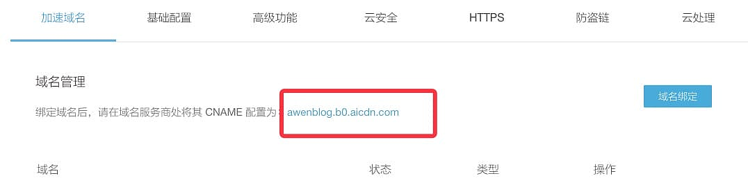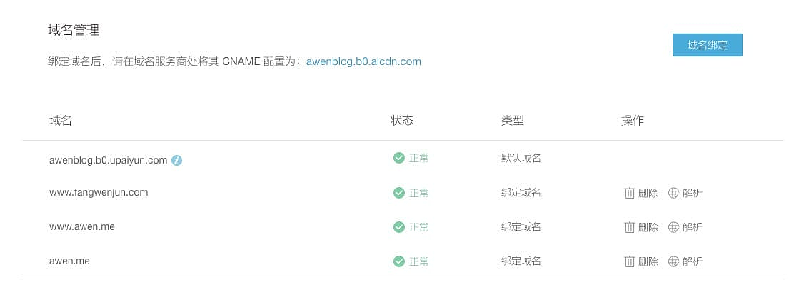 主要的问题就是在解析这块,去又拍云后台找到你创建的服务,点击进入后获取 CNAME 解析的配置值,通常格式是bucket.b0.aicdn.com。比如我的服务名是 awenblog,那么解析值就是awenblog.b0.aicdn.com