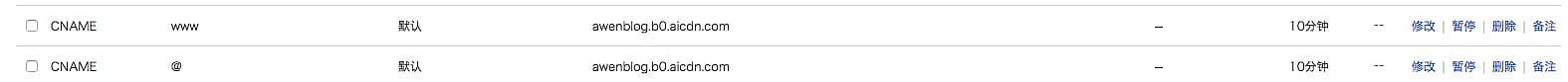 最重要的一步,设置 CNAME 解析,我这里以阿里云为例,在对应域名中删除 A 记录的 www 和@,添加2条 CNAME 解析,分别是 www 和@ 将记录值设置为又拍云后台的值,我这里是awenblog.b0.aicdn.com,需要注意的是,必须保证 A 记录与 CNAME 的主机记录不能冲突 否则无法保存。