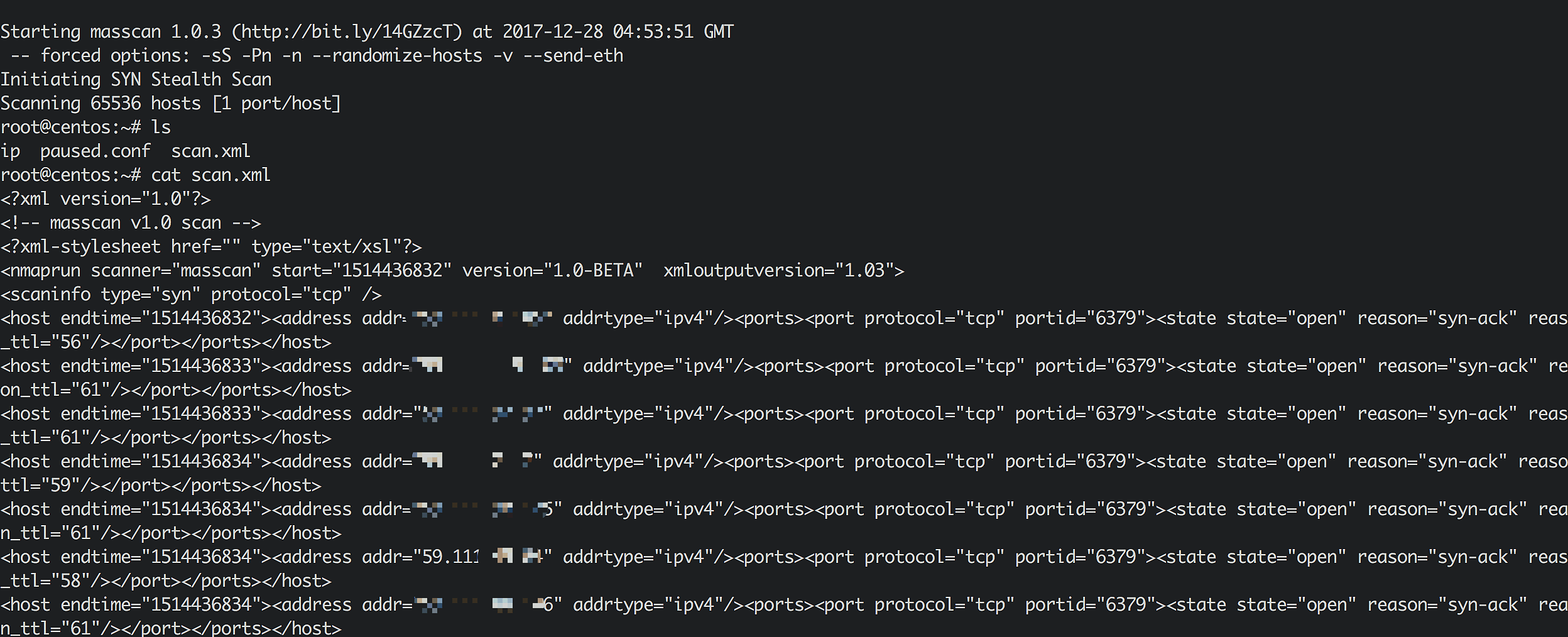 masscan -p6379 59.111.0.0/16 --rate 10000 -oX scan.xml