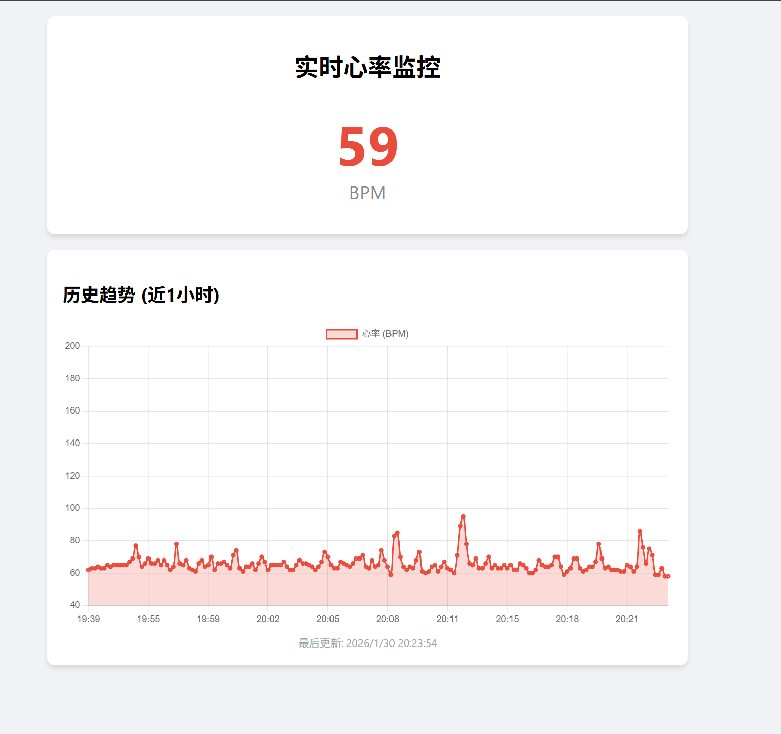 <div class="container"> <h2>历史趋势 (近1小时)</h2> <div class="chart-container"> <canvas id="hrChart"></canvas> </div> <div class="status" id="lastUpdated">等待数据...</div> </div>