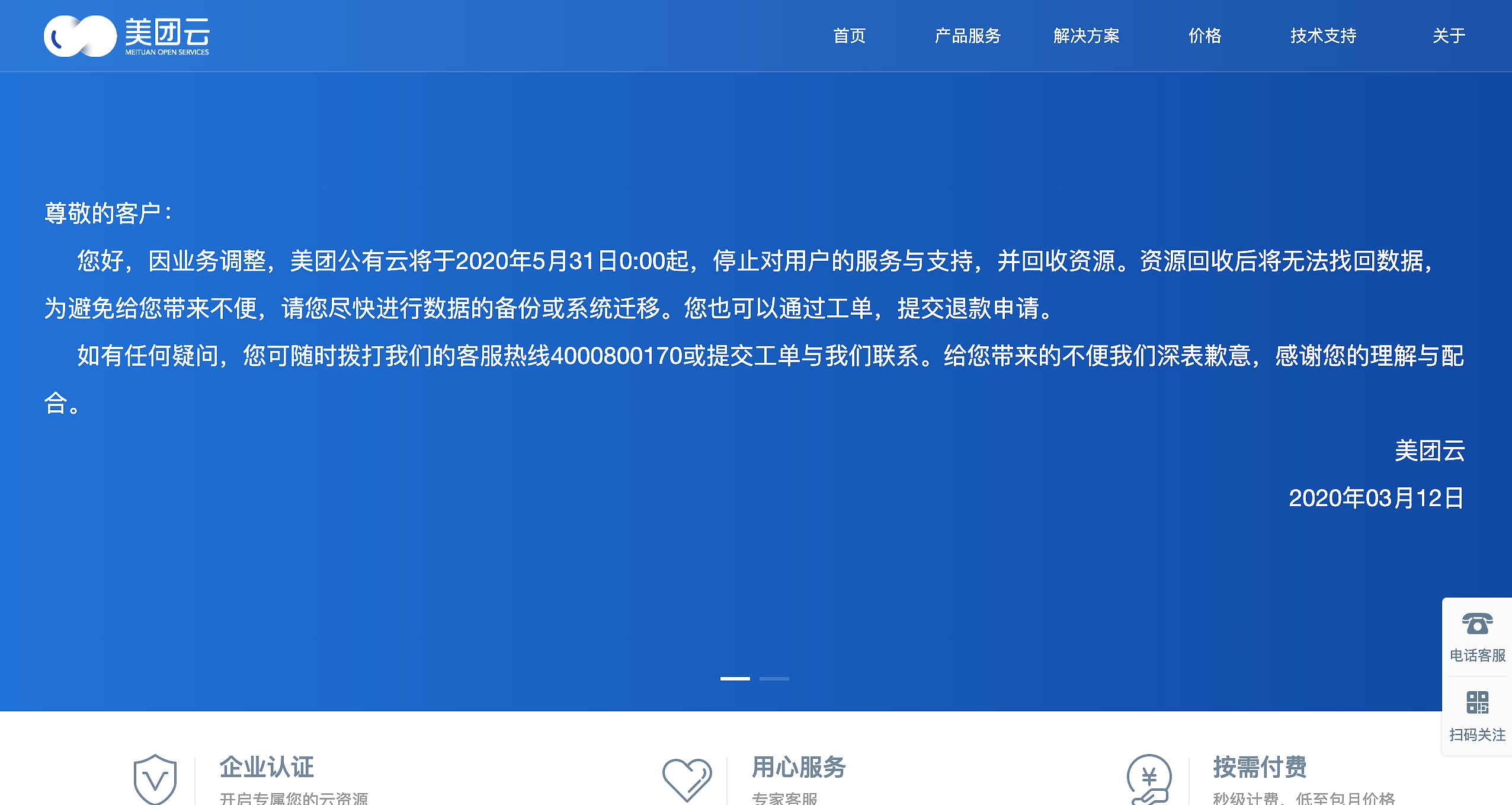 2020年3月12日,美团云正式对外发布公告,称因业务调整,美团公有云将于2020年5月31日0:00起,停止对用户的服务与支持,并回收资源。资源回收后将无法找回数据。这也是美团云在内部放弃公有云后两年,正式披露停服时间。