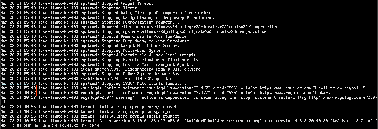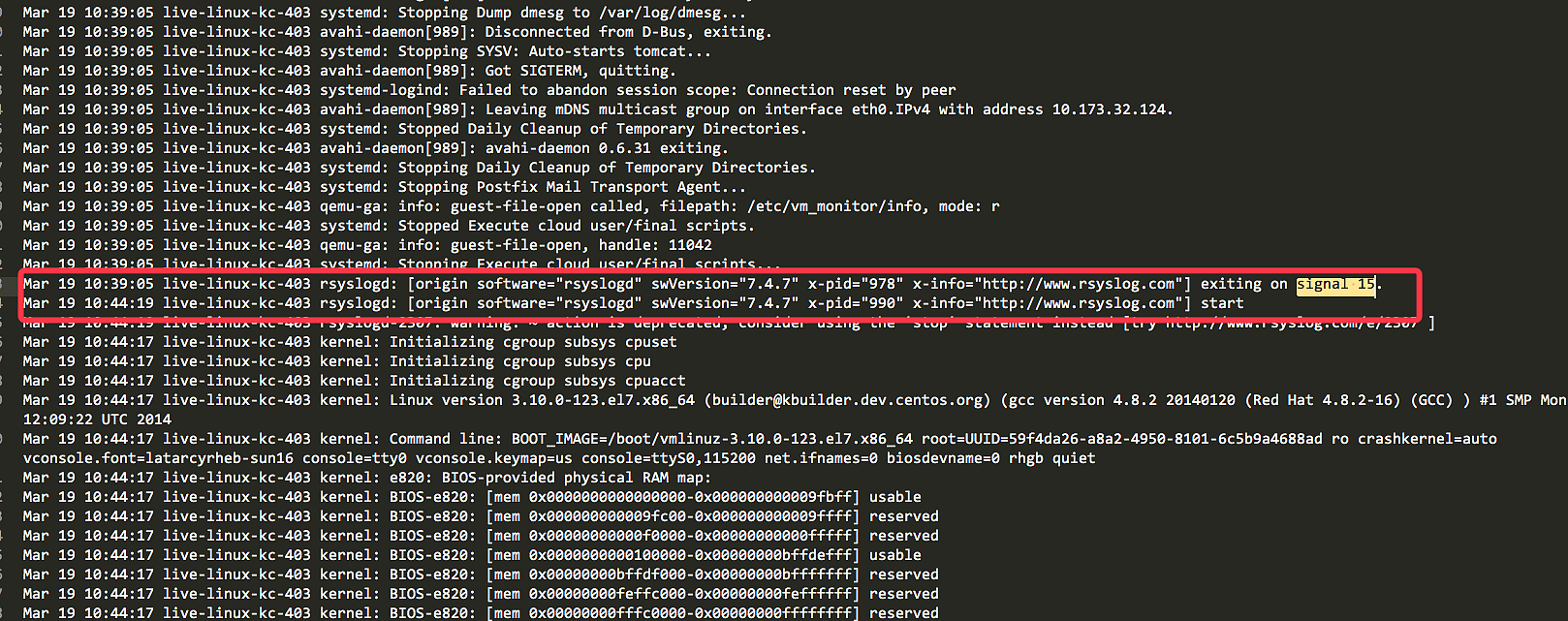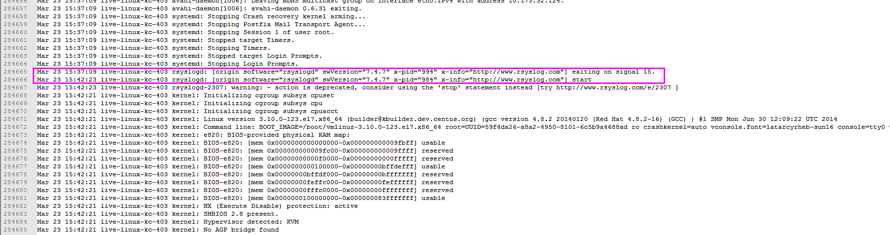 Mar 19 18 :14 :06 live-linux-kc-403 systemd: Stopping ACPI Event Daemon...Mar 19 18 :14 :06 live-linux-kc-403 systemd: Stopping Avahi mDNS/DNS-SD Stack...Mar 19 18 :14 :06 live-linux-kc-403 rsyslogd: [origin software="rsyslogd" swVersion="7.4.7" x-pid="990" x-info="http://www.rsyslog.com"] exiting on signal 15. Mar 19 18:14:20 live-linux-kc-403 rsyslogd: [origin software="rsyslogd" swVersion="7.4.7" x-pid="1010" x-info="http://www.rsyslog.com"] start Mar 19 18:14:20 live-linux-kc-403 rsyslogd-2307: warning: ~ action is deprecated, consider using the 'stop' statement instead [try http://www.rsyslog.com/e/2307 ] Mar 19 18 :14 :18 live-linux-kc-403 kernel: Initializing cgroup subsys cpusetMar 19 18 :14 :18 live-linux-kc-403 kernel: Initializing cgroup subsys cpuMar 19 18 :14 :18 live-linux-kc-403 kernel: Initializing cgroup subsys cpuacctMar 19 18 :14 :18 live-linux-kc-403 kernel: Linux version 3 .10 .0 -123 .el7.x86_64 (builder@kbuilder.dev.centos.org) (gcc version 4 .8 .2 20140120 (Red Hat 4 .8 .2 -16 ) (GCC) ) #1 SMP Mon Jun 30 12 :09 :22 UTC 2014 Mar 19 18 :14 :18 live-linux-kc-403 kernel: Command line: BOOT_IMAGE=/boot/vmlinuz-3 .10 .0 -123 .el7.x86_64 root=UUID=59 f4da26-a8a2-4950 -8101 -6 c5b9a4688ad ro crashkernel=auto vconsole.font=latarcyrheb-sun16 console=tty0 vconsole.keymap=us console=ttyS0,115200 net.ifnames=0 biosdevname=0 rhgb quiet