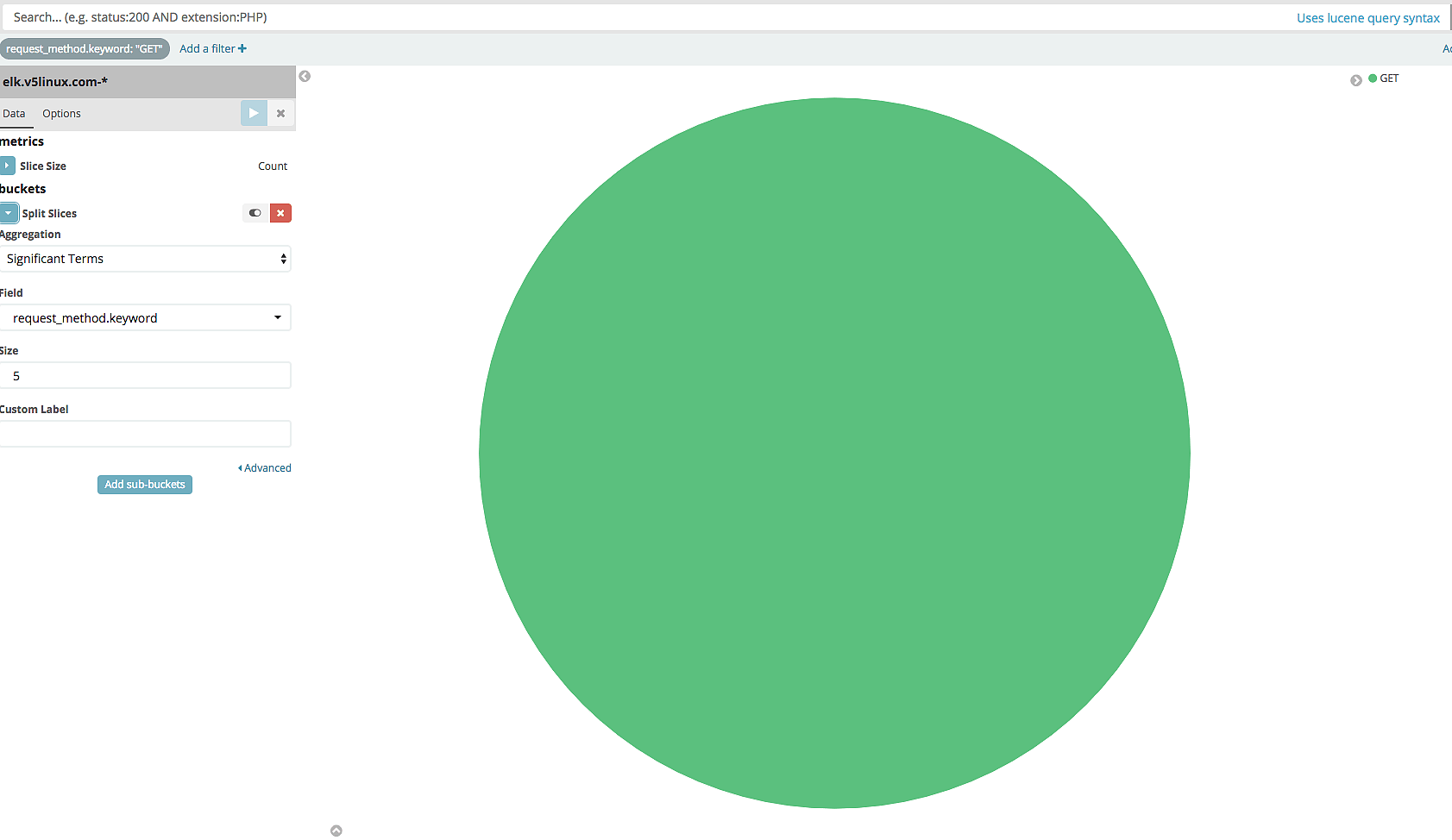 首先,创建一个Pie,用来统计某个时间段的 HTTP 请求方法,比如 GET POST PUT DELETE 等等的占比。