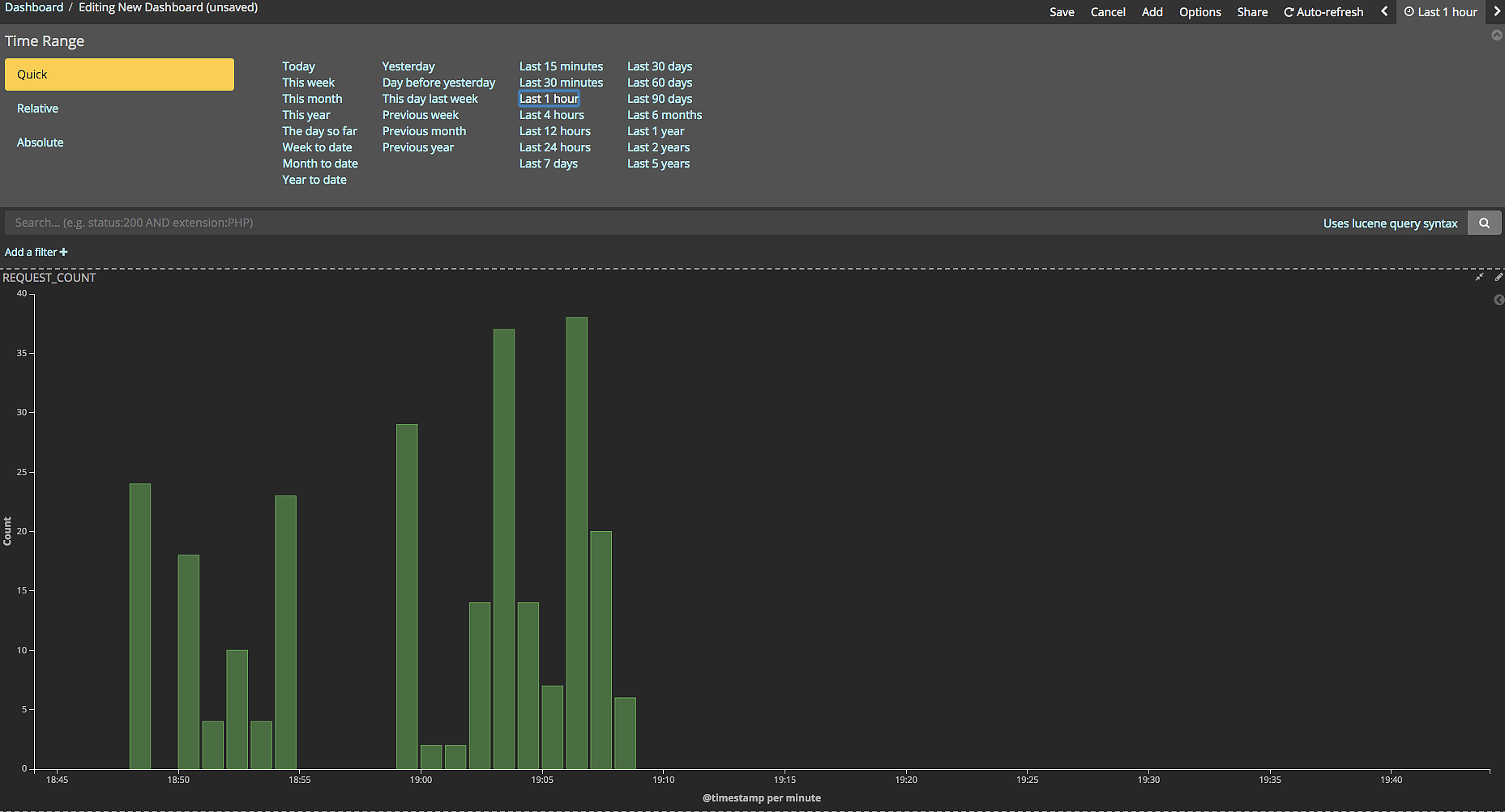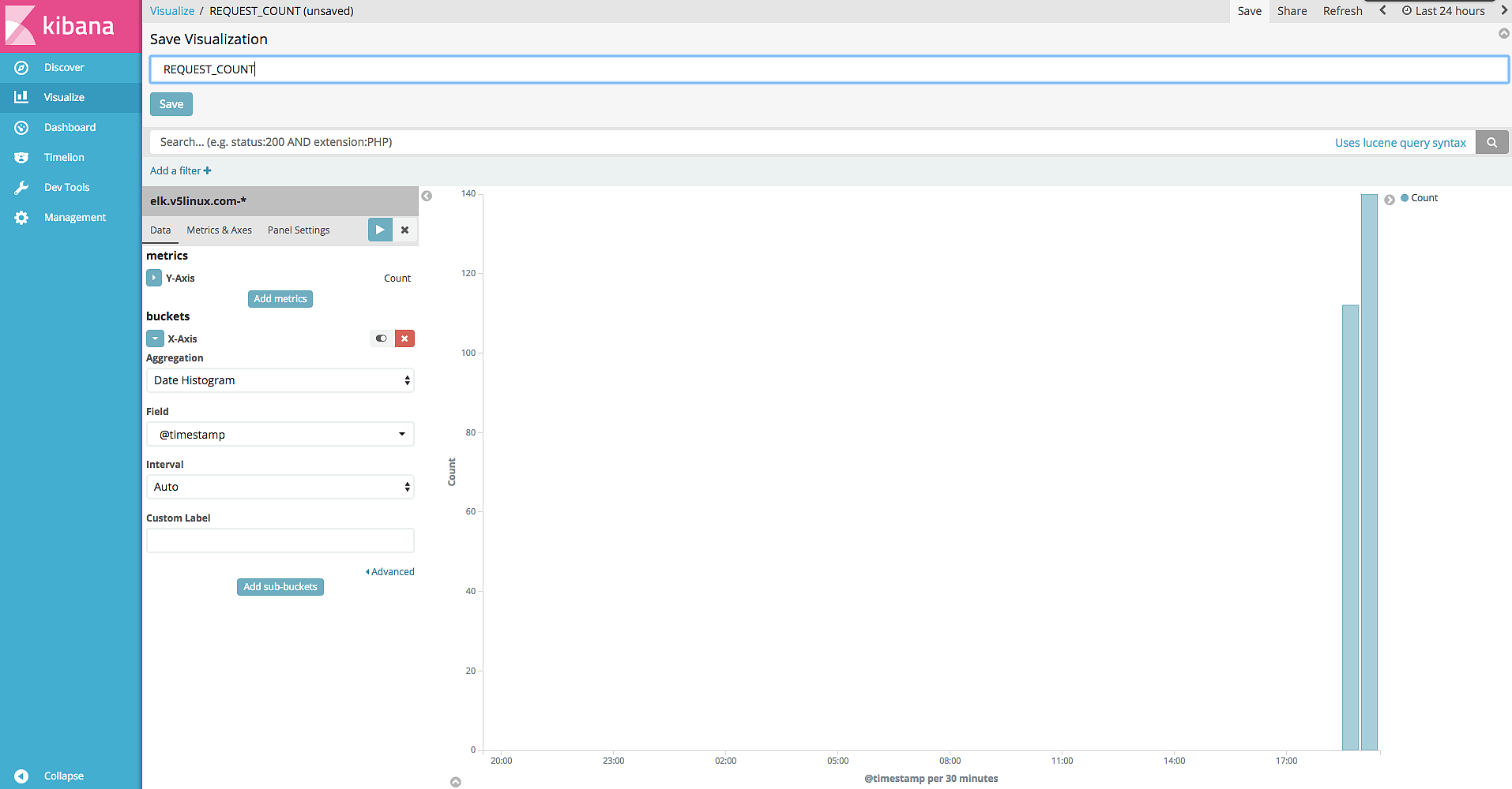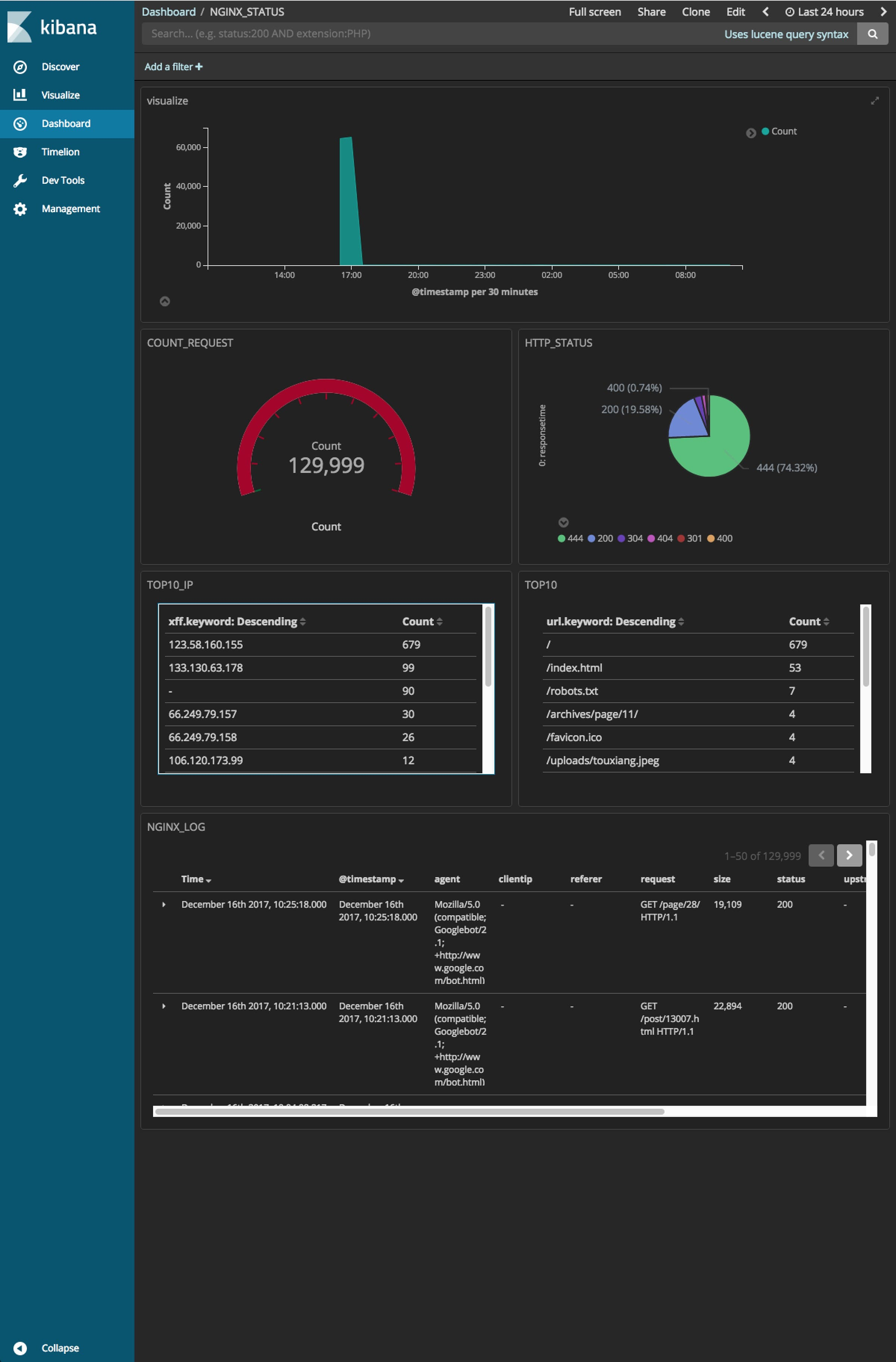 你可以继续添加 visualize 监控其他指标,比如请求状态码、请求做多的 IP 或 URL 等等,最终配置如图所示