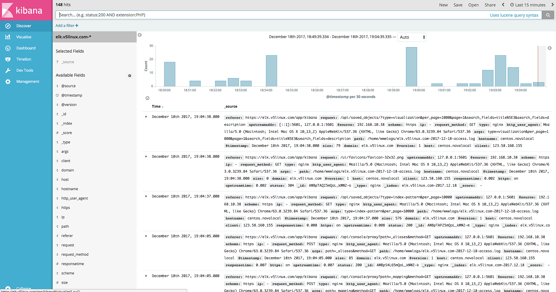 {"@timestamp " :"2017-12-18T18:54:21+08:00" ,"@source " :"192.168.10.38" ,"hostname" :"centos.novalocal" ,"ip" :"-" ,"client" :"123.58.160.155" ,"request_method" :"GET" ,"scheme" :"https" ,"domain" :"elk.v5linux.com" ,"referer" :"https://elk.v5linux.com/status" ,"request" :"/plugins/kibana/assets/dashboard.svg" ,"args" :"-" ,"size" :0 ,"status" : 304 ,"responsetime" :0.003 ,"upstreamtime" :"0.003" ,"upstreamaddr" :"127.0.0.1:5601" ,"http_user_agent" :"Mozilla/5.0 (Macintosh; Intel Mac OS X 10_13_2) AppleWebKit/537.36 (KHTML, like Gecko) Chrome/63.0.3239.84 Safari/537.36" ,"https" :"on" }