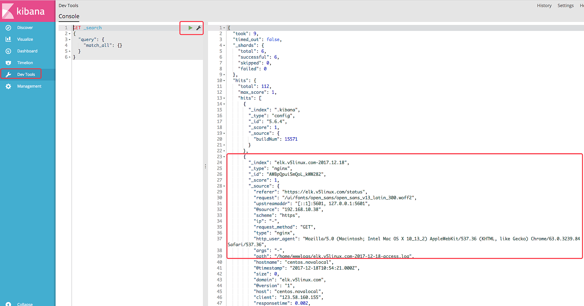 定义完成后 重启 logstash 。然后打开 kibana,点击dev_tools 执行默认的