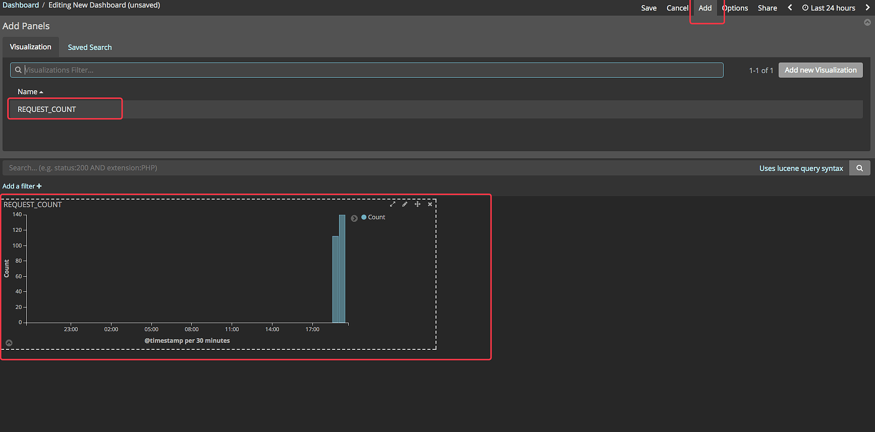 点击 ADD 添加刚才创建的 visualize ,如图所示,然后保存