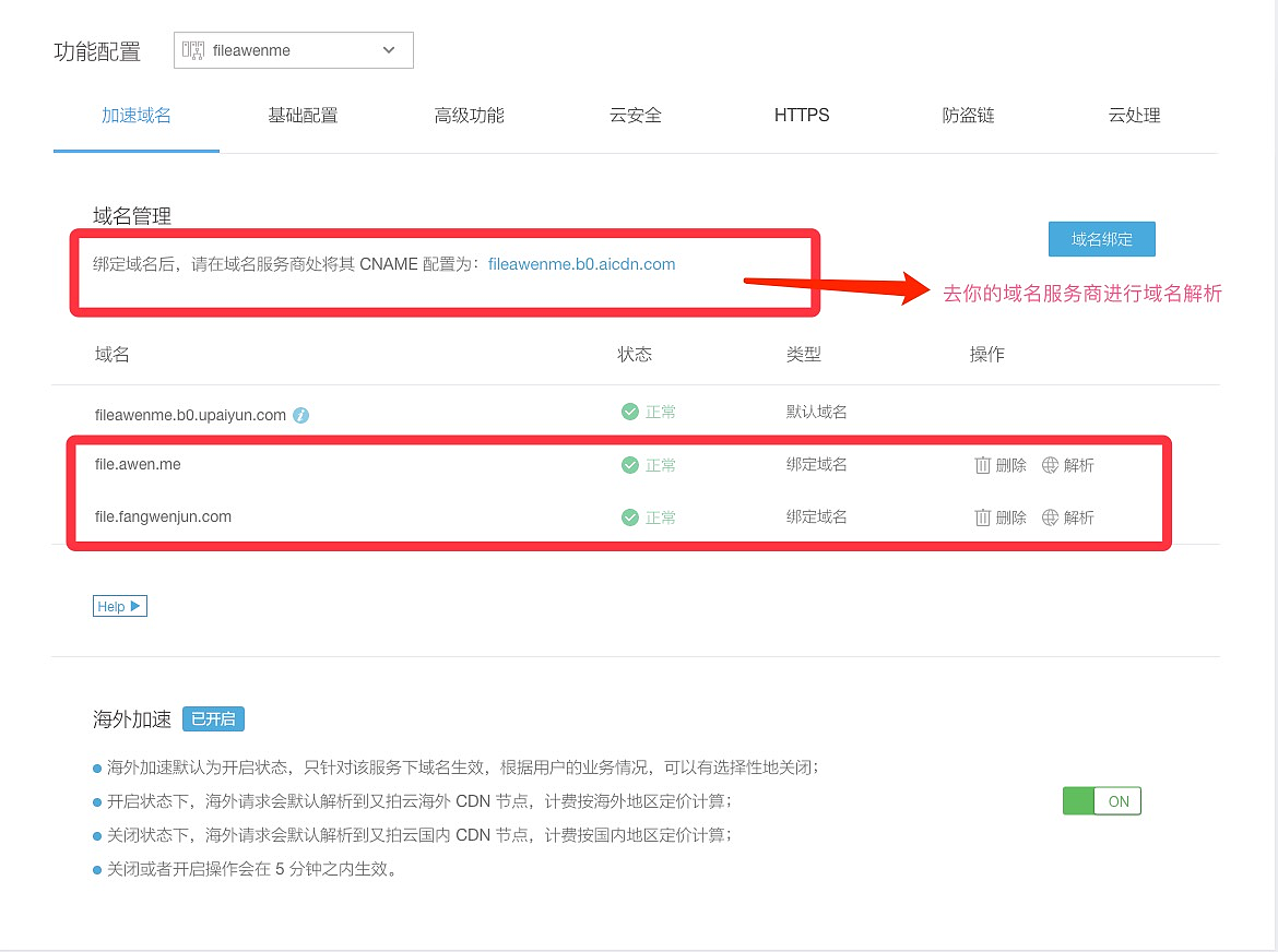 然后,点击菜单栏上的服务,在服务列表中找到你刚才创建的服务,点击配置,绑定你的域名,然后去域名解析商那边做下 CNAME 解析,解析值一般是你的servername.b0.aicdn.com