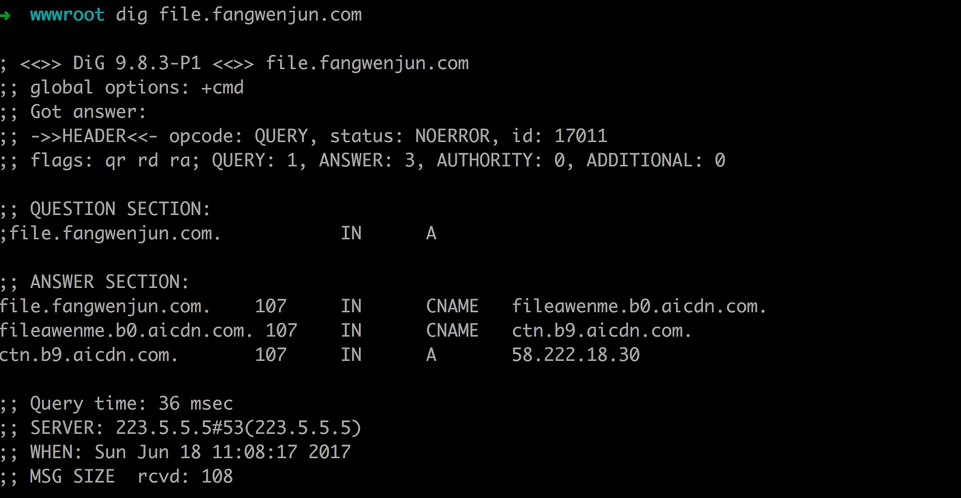 然后我们可以通过 dig 看下域名是否解析过来