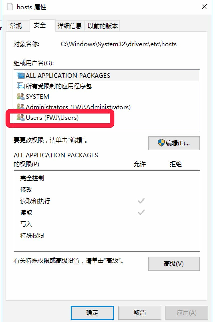 但是默认情况下我们是没有权限修改他的,默认这个文件只有只读权限,我们需要修改他的权限,让当前的用户对其有读写权限,右键选择属性–切换到安全,然后点击编辑,找到你当前使用的用户名通常是 User(xxx/xxx),